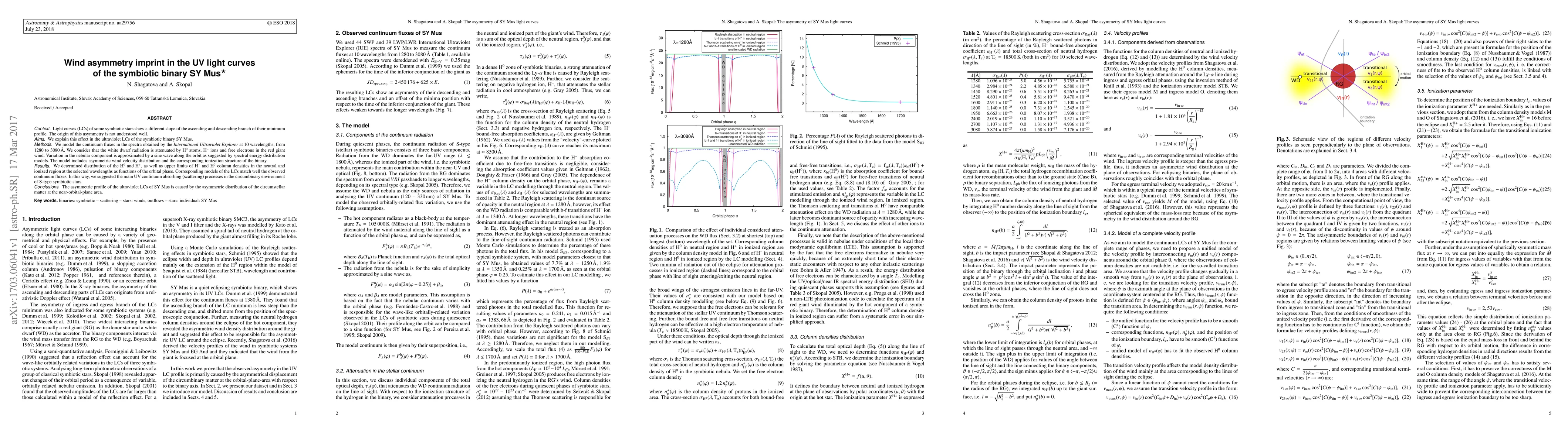 Context: Light curves (LCs) of some symbiotic stars show a different slope of the ascending and descending branch of their minimum profile. The origin of this asymmetry is not understood well. Aims: We explain this effect in the ultraviolet LCs of the symbiotic binary SY Mus. Methods: We model the continuum fluxes in the spectra obtained by the International Ultraviolet Explorer at 10 wavelengths, from 1280 to 3080 \AA. We consider that the white dwarf radiation is attenuated by $H^0$ atoms, $H^-$ ions and free electrons in the red giant wind. Variation in the nebular component is approximated by a sine wave along the orbit as suggested by spectral energy distribution models. The model includes asymmetric wind velocity distribution and the corresponding ionization structure of the binary. Results: We determined distribution of the $H^0$ and $H^+$, as well as upper limits of $H^-$ and $H^0$ column densities in the neutral and ionized region at the selected wavelengths as functions of the orbital phase. Corresponding models of the LCs match well the observed continuum fluxes. In this way, we suggested the main UV continuum absorbing (scattering) processes in the circumbinary environment of S-type symbiotic stars. Conclusions: The asymmetric profile of the ultraviolet LCs of SY Mus is caused by the asymmetric distribution of the circumstellar matter at the near-orbital-plane area.