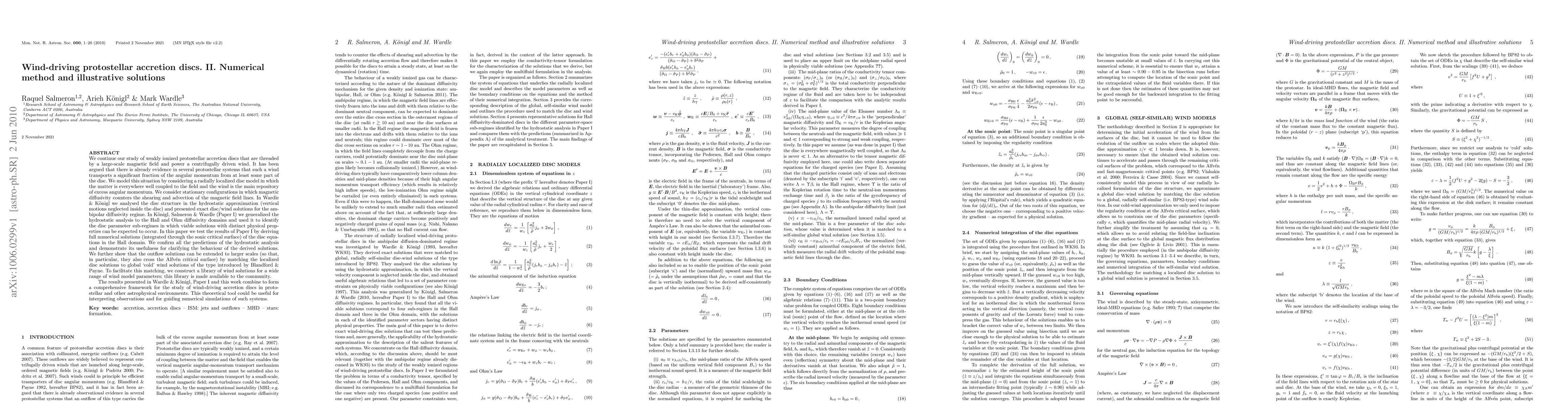 (abridged) We continue our study of weakly ionized protostellar discs that are threaded by a large-scale magnetic field and power a centrifugally driven wind. It has been argued that in several protostellar systems such a wind transports a significant fraction of the angular momentum from at least some part of the disc. We model this case by considering a radially localized disc model in which the matter is well coupled to the field and the wind is the main repository of excess angular momentum. We consider stationary solutions in which magnetic diffusion counters the shearing and advection of the field lines. In Wardle & K\"onigl we analysed the disc structure in the hydrostatic approximation and presented disc/wind solutions for the ambipolar diffusivity regime. In K\"onigl, Salmeron & Wardle (Paper I) we generalized the hydrostatic analysis to the Hall and Ohm diffusivity domains and identified the parameter sub-regimes in which viable solutions occur. In this paper we test these results by deriving numerical solutions (integrated through the sonic critical surface) of the disc equations in the Hall domain. We confirm the predictions of the hydrostatic analysis and demonstrate its usefulness for clarifying the behaviour of the derived solutions. We show that the solutions can be extended to larger scales (so that they also cross the Alfv\'en critical surface) by matching the localized disc solutions to global wind solutions of the type introduced by Blandford & Payne. To facilitate this matching, we construct a library of wind solutions, which is made available to the community. The results presented in Wardle & K\"onigl, Paper I and this work form a comprehensive framework for the study of wind-driving accretion discs in protostellar and other astrophysical environments. This tool could be useful for interpreting observations and for guiding numerical simulations of such systems.