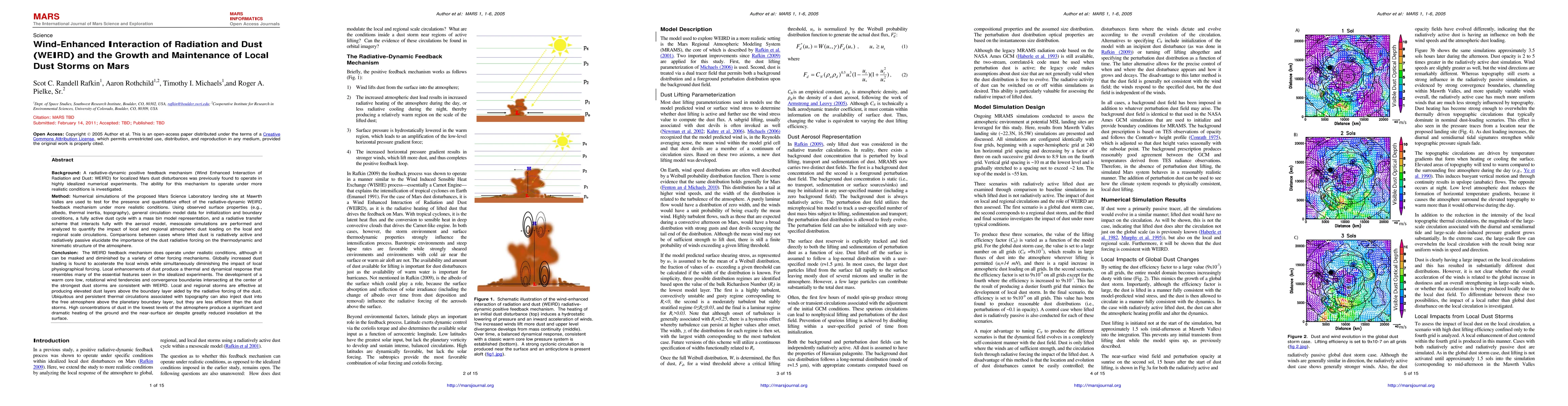 Numerical simulations confirm the existence of the Wind-Enhanced Interaction of Radiation and Dust (WEIRD) feedback mechanism on Mars, which accelerates local winds and produces elevated dust layers with significant radiative forcing effects.