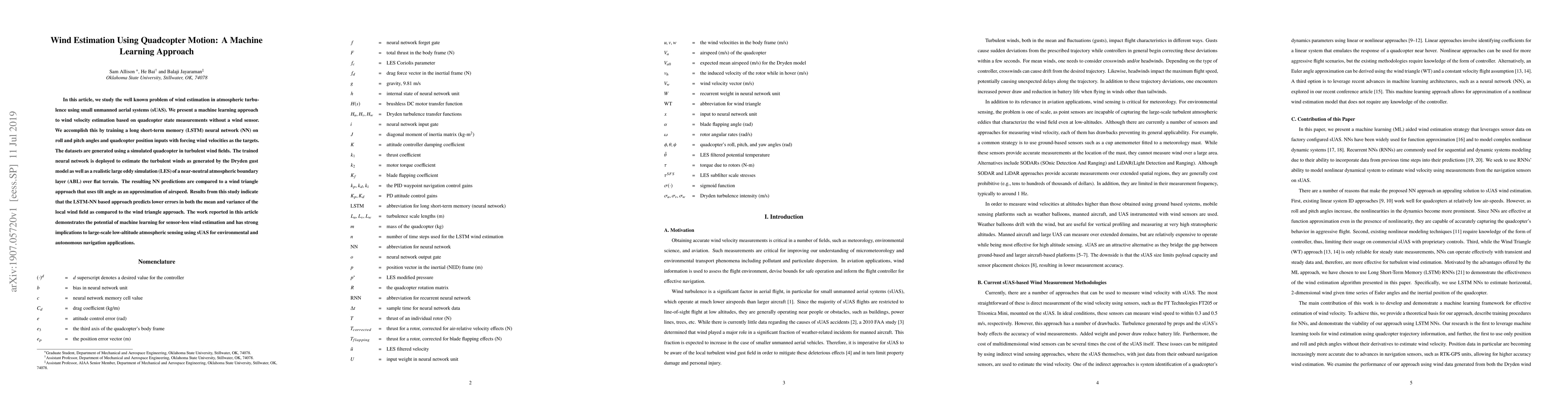 This paper proposes a machine learning method using LSTM neural networks to estimate wind velocity from quadcopter motion data without a wind sensor. The LSTM model trained on roll, pitch angles, and position data shows lower error in predicting turbulent wind compared to traditional wind triangle methods, highlighting the potential of machine learning for sensor-less atmospheric sensing.