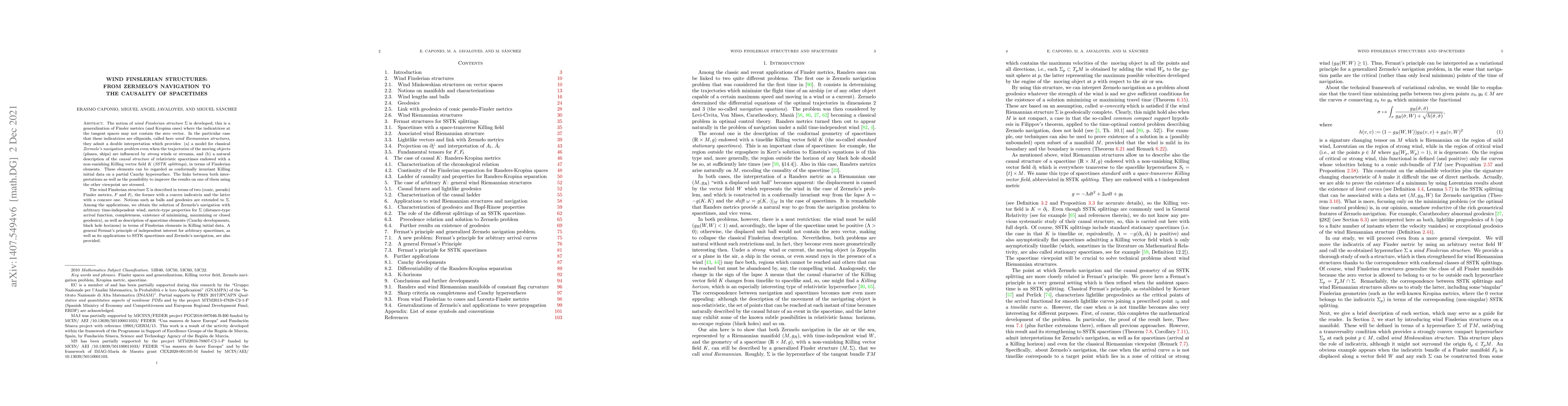 This paper develops wind Finslerian structures, a generalization of Finsler metrics allowing non-zero indicatrices, and applies them to solve Zermelo's navigation problem and describe the causal structure of relativistic spacetimes with non-vanishing Killing vector fields. It also explores Randers-Kropina metrics and provides a unified causal analysis in Finslerian terms.