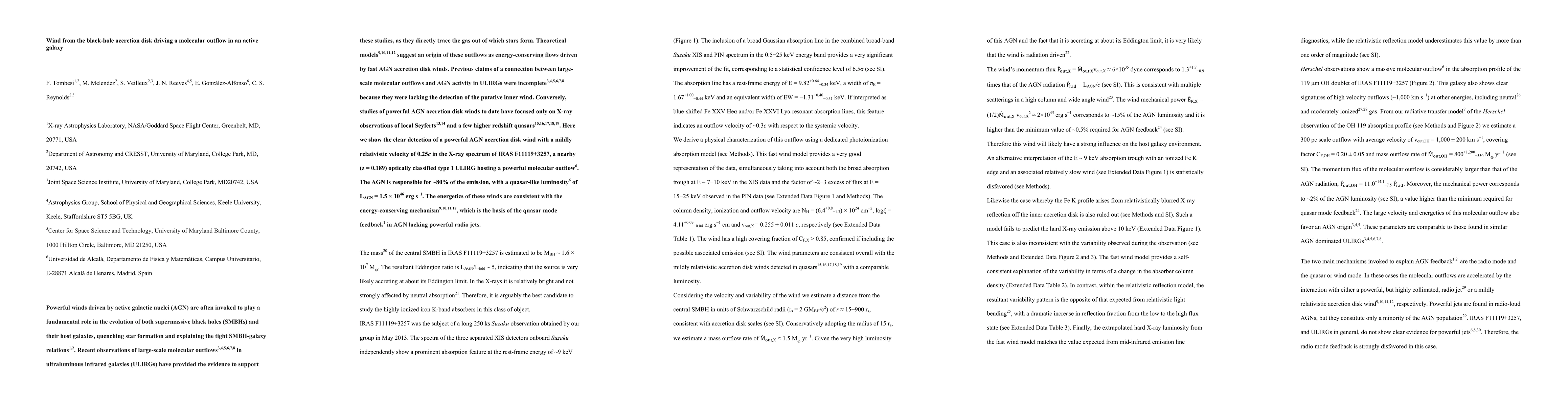 This paper reports the detection of a powerful, mildly relativistic accretion disk wind from the active galactic nucleus (AGN) in IRAS F11119+3257, linking it to a large-scale molecular outflow. This wind, with a velocity of 0.25c, supports theoretical models suggesting energy-conserving flows driven by AGN accretion disk winds, providing crucial evidence for AGN-driven feedback mechanisms in ultra-luminous infrared galaxies.