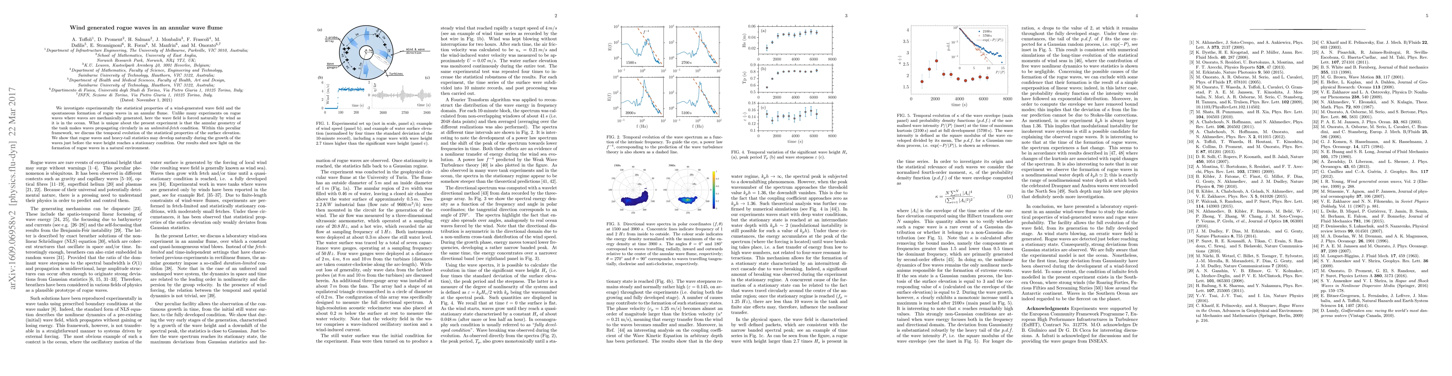 We investigate experimentally the statistical properties of a wind-generated wave field and the spontaneous formation of rogue waves in an annular flume. Unlike many experiments on rogue waves, where waves are mechanically generated, here the wave field is forced naturally by wind as it is in the ocean. What is unique about the present experiment is that the annular geometry of the tank makes waves propagating circularly in an {\it unlimited-fetch} condition. Within this peculiar framework, we discuss the temporal evolution of the statistical properties of the surface elevation. We show that rogue waves and heavy-tail statistics may develop naturally during the growth of the waves just before the wave height reaches a stationary condition. Our results shed new light on the formation of rogue waves in a natural environment.