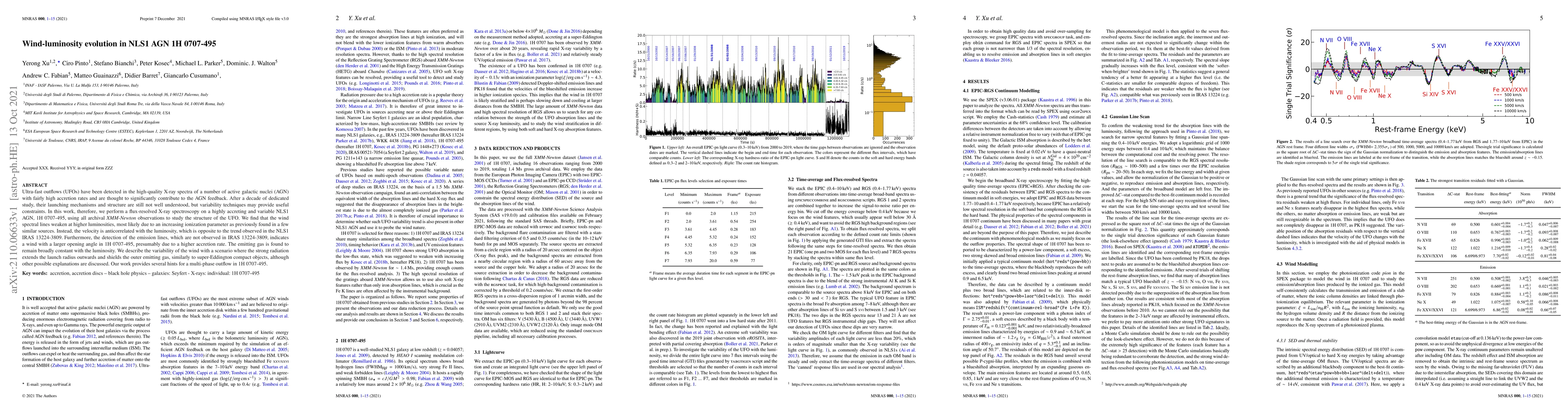 This study uses XMM-Newton data to analyze ultra-fast outflows in the NLS1 AGN 1H 0707-495, finding that wind spectral lines weaken at higher luminosities due to increased ionization, while velocity is anticorrelated with luminosity. The detection of emission lines suggests a larger opening angle in the wind, likely due to a higher accretion rate.