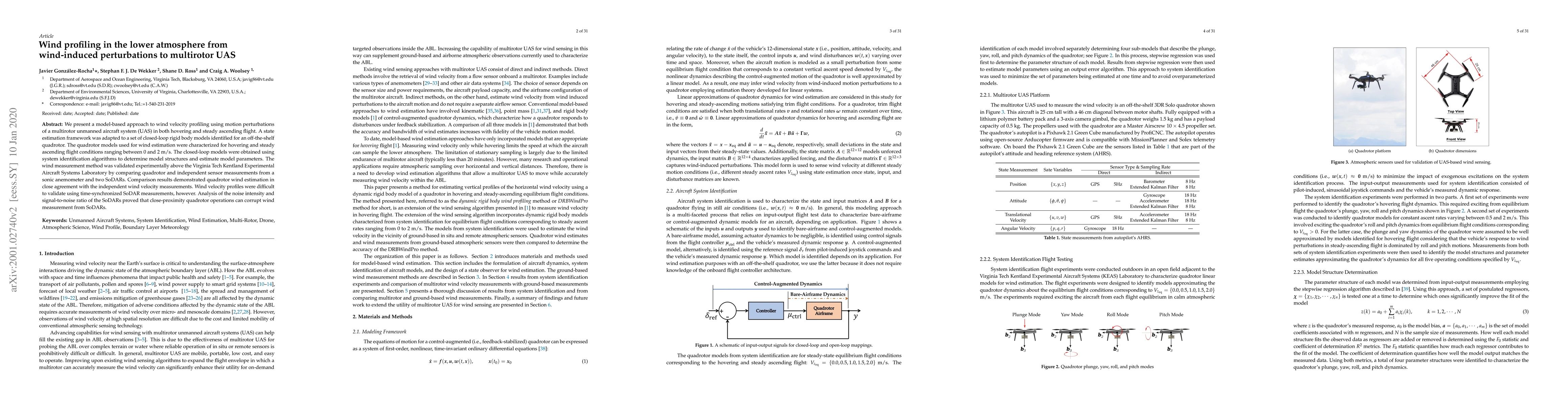 We present a model-based approach to wind velocity profiling using motion perturbations of a multirotor unmanned aircraft system (UAS) in both hovering and steady ascending flight. A state estimation framework was adapted to a set of closed-loop rigid body models identified for an off-the-shelf quadrotor. The quadrotor models used for wind estimation were characterized for hovering and steady ascending flight conditions ranging between 0 and 2 m/s. The closed-loop models were obtained using system identification algorithms to determine model structures and estimate model parameters. The wind measurement method was validated experimentally above the Virginia Tech Kentland Experimental Aircraft Systems Laboratory by comparing quadrotor and independent sensor measurements from a sonic anemometer and two SoDARs. Comparison results demonstrated quadrotor wind estimation in close agreement with the independent wind velocity measurements. Wind velocity profiles were difficult to validate using time-synchronized SoDAR measurements, however. Analysis of the noise intensity and signal-to-noise ratio of the SoDARs proved that close-proximity quadrotor operations can corrupt wind measurement from SoDARs.
