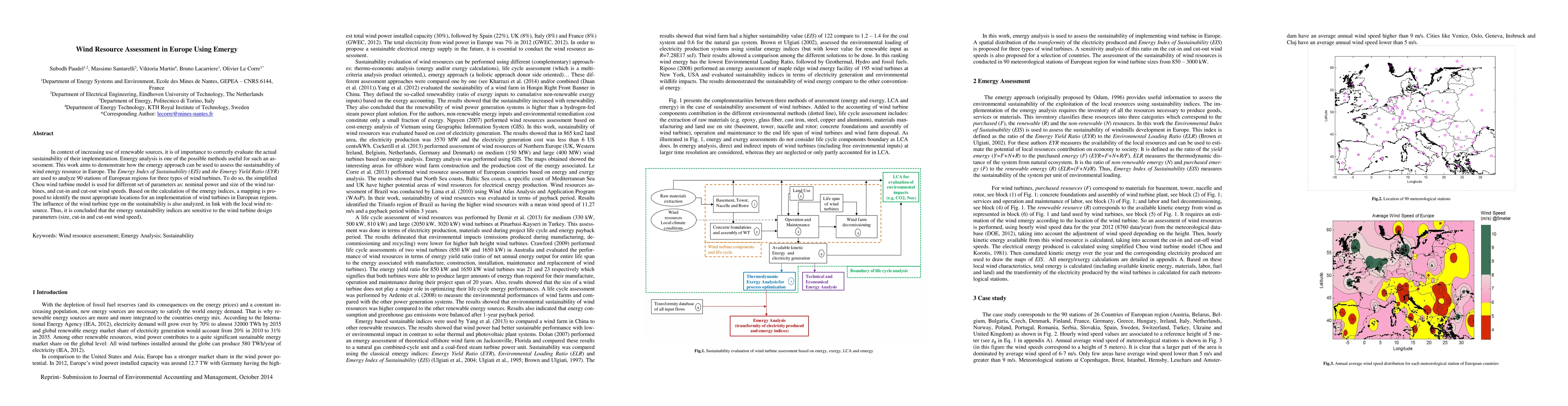In context of increasing use of renewable sources, it is of importance to correctly evaluate the actual sustainability of their implementation. Emergy analysis is one of the possible methods useful for such an assessment. This work aims to demonstrate how the emergy approach can be used to assess the sustainability of wind energy resource in Europe. The Emergy Index of Sustainability (EIS) and the Emergy Yield Ratio (EYR) are used to analyze 90 stations of European regions for three types of wind turbines. To do so, the simplified Chou wind turbine model is used for different set of parameters as: nominal power and size of the wind turbines, and cut-in and cut-out wind speeds. Based on the calculation of the emergy indices, a mapping is proposed to identify the most appropriate locations for an implementation of wind turbines in European regions. The influence of the wind turbine type on the sustainability is also analyzed, in link with the local wind resource. Thus, it is concluded that the emergy sustainability indices are sensitive to the wind turbine design parameters (size, cut-in and cut-out wind speed).