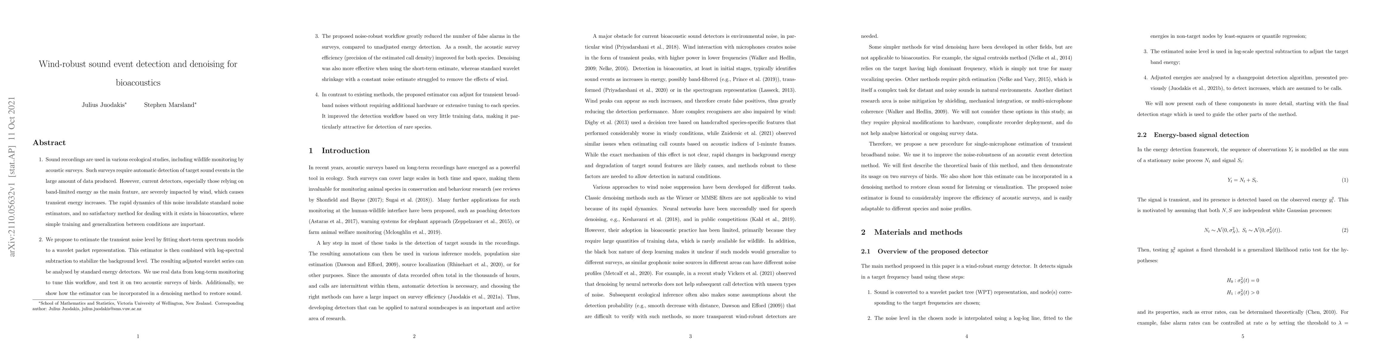 A new method for detecting sound events in noisy environments, such as wind, improves accuracy and efficiency in acoustic wildlife monitoring. The approach uses a short-term spectrum model to estimate transient noise levels and combines it with log-spectral subtraction to stabilize the background level.