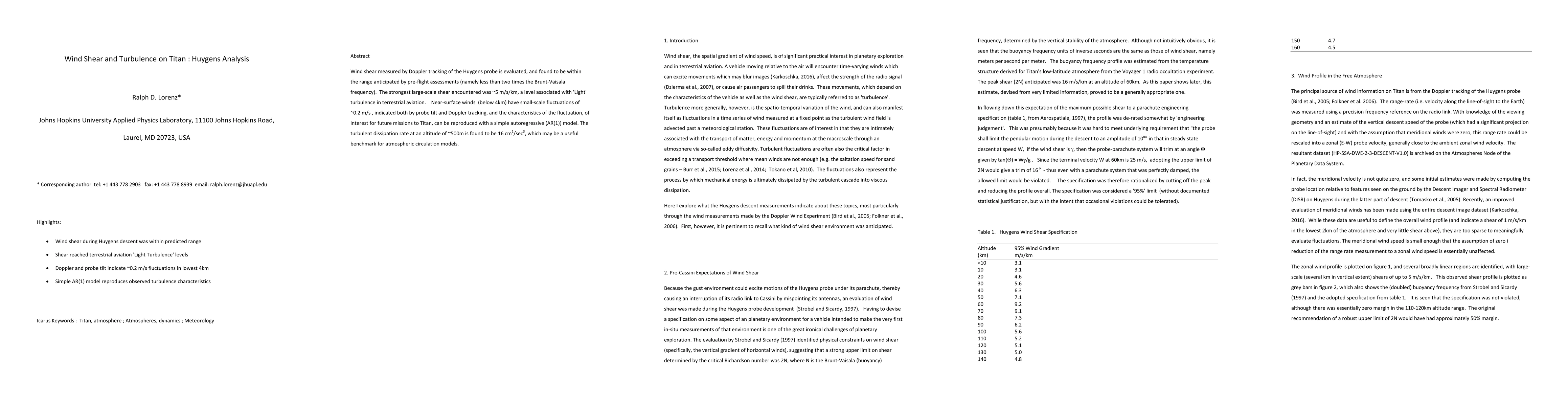 Wind shear measured by Doppler tracking of the Huygens probe is evaluated, and found to be within the range anticipated by pre-flight assessments (namely less than two times the Brunt-Vaisala frequency). The strongest large-scale shear encountered was ~5 m/s/km, a level associated with 'Light' turbulence in terrestrial aviation. Near-surface winds (below 4km) have small-scale fluctuations of ~0.2 m/s , indicated both by probe tilt and Doppler tracking, and the characteristics of the fluctuation, of interest for future missions to Titan, can be reproduced with a simple autoregressive (AR(1)) model. The turbulent dissipation rate at an altitude of ~500m is found to be 16 cm2/sec3, which may be a useful benchmark for atmospheric circulation models.