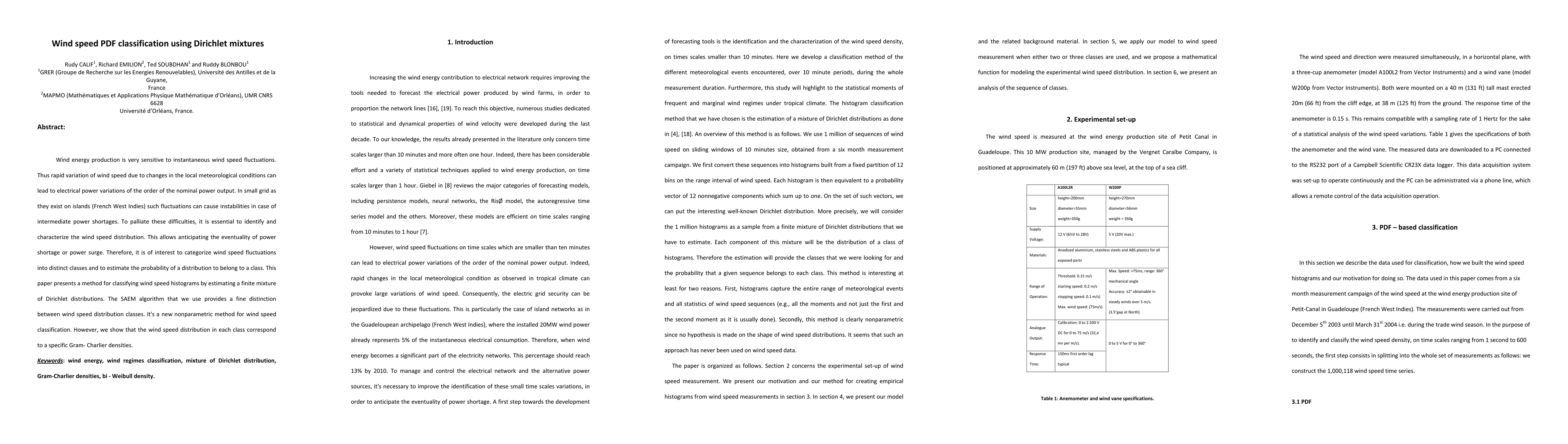 Wind energy production is very sensitive to instantaneous wind speed fluctuations. Thus rapid variation of wind speed due to changes in the local meteorological conditions can lead to electrical power variations of the order of the nominal power output. In small grids, as they exist for example on some islands in the French West Indies, such fluctuations can cause instabilities in case of intermediate power shortages. To palliate these difficulties, it is essential to identify and characterize the wind speed distributions. This allows to anticipate the eventuality of power shortage or power surge. Therefore, it is of interest to categorize wind speed fluctuations into distinct classes and to estimate the probability of a distribution to belong to a class. This paper presents a method for classifying wind speed histograms by estimating a finite mixture of Dirichlet distributions. The SAEM algorithm that we use provides a fine distinction between wind speed distribution classes. It's a new nonparametric method for wind speed sequences classification. However, we show that the wind speed distributions in each class correspond to specific Gram- Charlier densities.