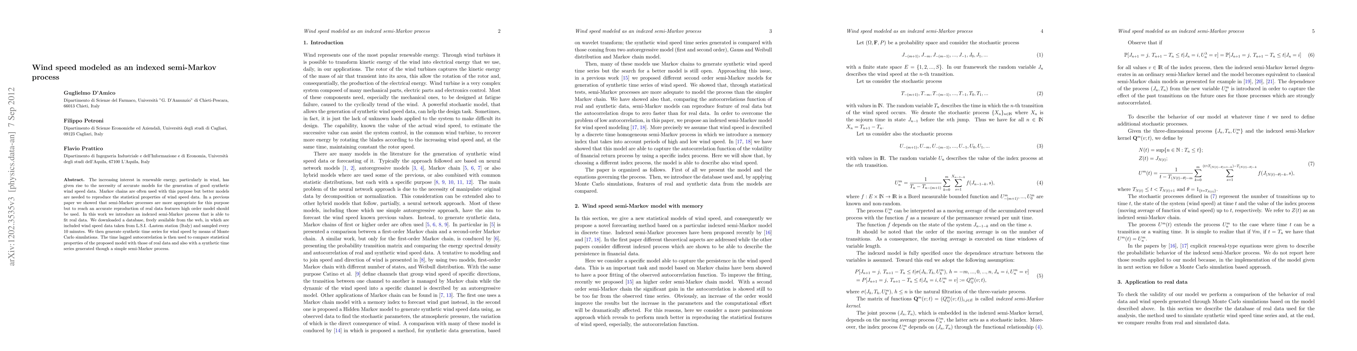 This paper proposes an indexed semi-Markov process to model wind speed data, aiming for a more accurate reproduction of real wind speed characteristics compared to traditional Markov models. The authors validate their model using real data from L.S.I. -Lastem station and compare its statistical properties through time lagged autocorrelation with both real and synthetic data from a simple semi-Markov process.