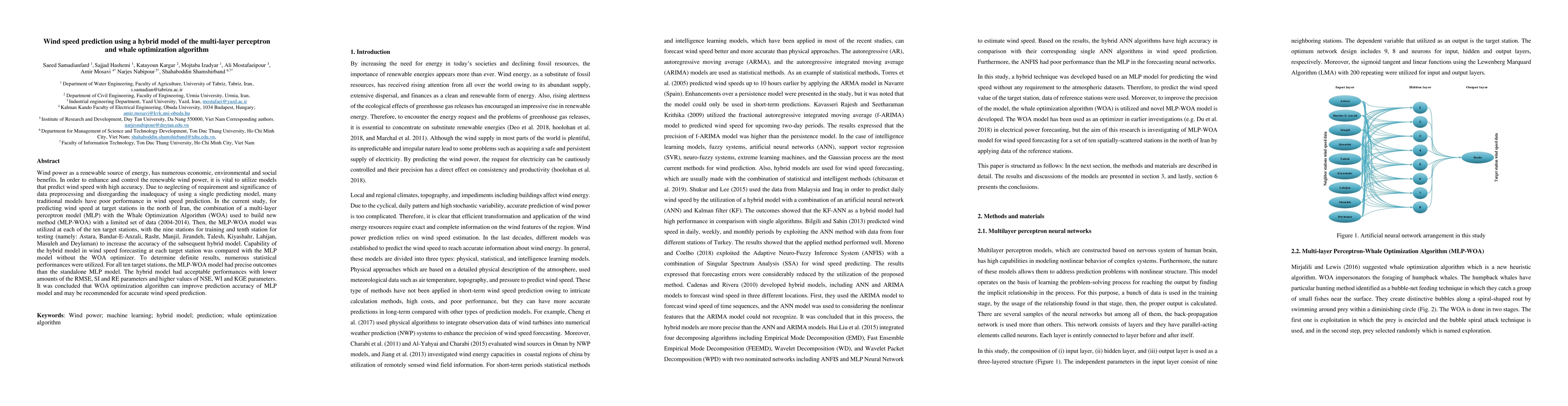 This study combines a multi-layer perceptron (MLP) with the Whale Optimization Algorithm (WOA) to create a hybrid MLP-WOA model for accurate wind speed prediction in northern Iran. The hybrid model outperformed the standalone MLP model, demonstrating better statistical performance metrics.