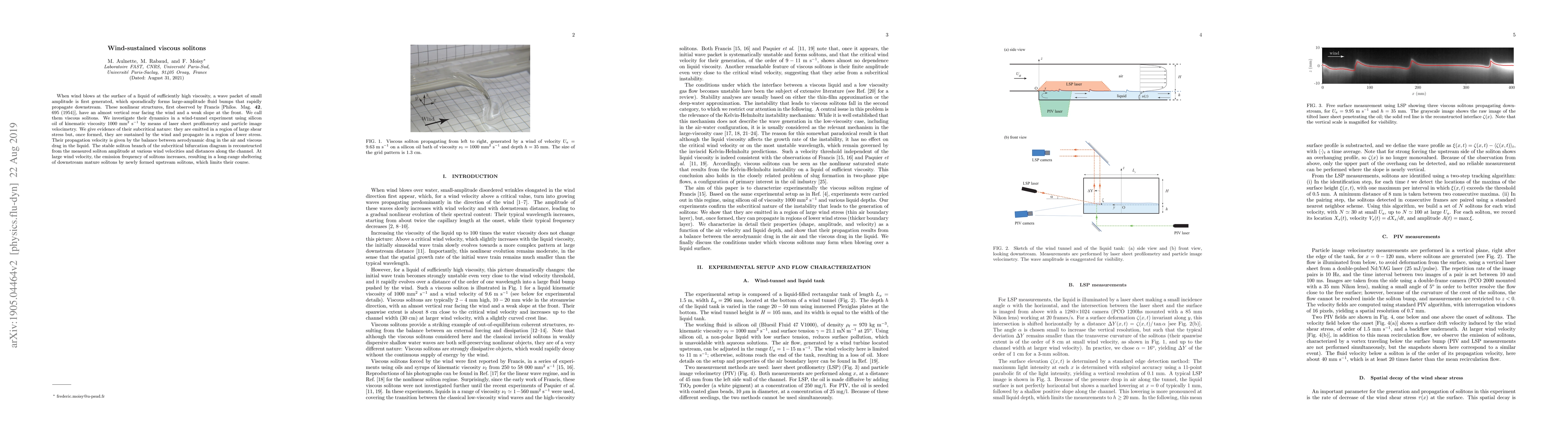 This research presents wind-tunnel experiments on 'viscous solitons' formed by high-viscosity liquid (silicon oil) under wind, observed using laser and PIV techniques. Key findings include their subcritical nature, sustenance by wind and viscous drag, and propagation velocity determined by air and liquid resistance balance. Soliton formation and movement are influenced by wind velocity, with higher velocities increasing emission frequency and affecting downstream soliton courses.