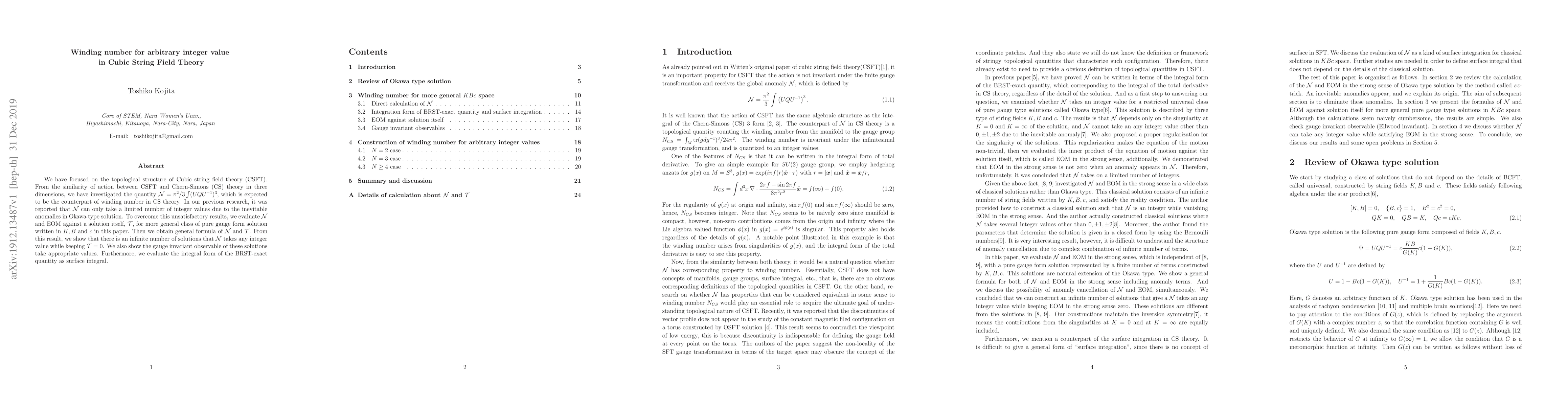 We have focused on the topological structure of Cubic string field theory (CSFT). From the similarity of action between CSFT and Chern-Simons (CS) theory in three dimensions, we have investigated the quantity ${\cal N}=\pi^2/3\int (UQU^{-1})^3$, which is expected to be the counterpart of winding number in CS theory. In our previous research, it was reported that $\cal N$ can only take a limited number of integer values due to the inevitable anomalies in Okawa type solution. To overcome this unsatisfactory results, we evaluate $\cal N$ and EOM against a solution itself, $\cal T$, for more general class of pure gauge form solution written in $K,B$ and $c$ in this paper. Then we obtain general formula of $\cal N$ and $\cal T$. From this result, we show that there is an infinite number of solutions that $\cal N$ takes any integer value while keeping $\cal T=0$. We also show the gauge invariant observable of these solutions take appropriate values. Furthermore, we evaluate the integral form of the BRST-exact quantity as surface integral.