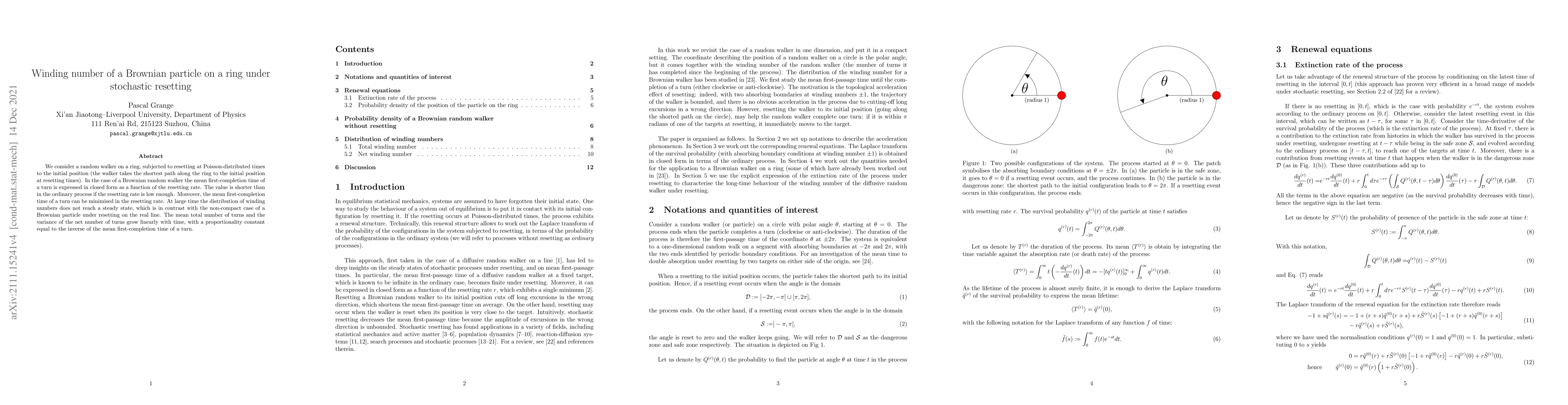 We consider a random walker on a ring, subjected to resetting at Poisson-distributed times to the initial position (the walker takes the shortest path along the ring to the initial position at resetting times). In the case of a Brownian random walker the mean first-completion time of a turn is expressed in closed form as a function of the resetting rate. The value is shorter than in the ordinary process if the resetting rate is low enough. Moreover, the mean first-completion time of a turn can be minimised in the resetting rate. At large time the distribution of winding numbers does not reach a steady state, which is in contrast with the non-compact case of a Brownian particle under resetting on the real line. The mean total number of turns (and the variance of the net number of turns) grow linearly with time, with a proportionality constant equal to the inverse of the mean first-completion time of a turn.