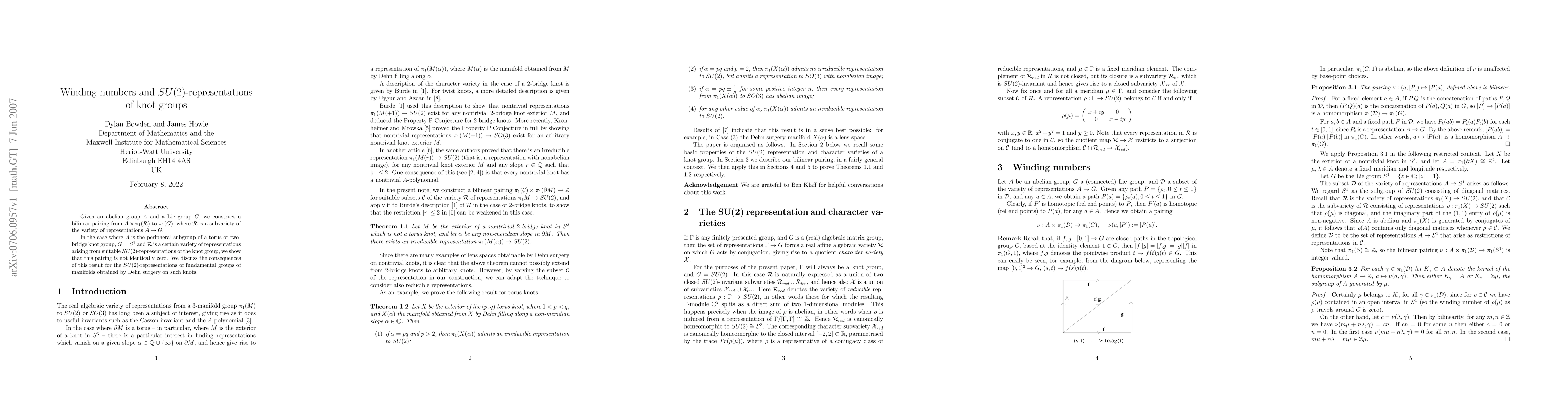 Given an abelian group $A$ and a Lie group $G$, we construct a bilinear pairing from $A\times\pi_1({\mathcal R})$ to $\pi_1(G)$, where $\mathcal R$ is a subvariety of the variety of representations $A\to G$. In the case where $A$ is the peripheral subgroup of a torus or two-bridge knot group, $G=S^1$ and $\mathcal R$ is a certain variety of representations arising from suitable SU(2)-representations of the knot group, we show that this pairing is not identically zero. We discuss the consequences of this result for the SU(2)-representations of fundamental groups of manifolds obtained by Dehn surgery on such knots.