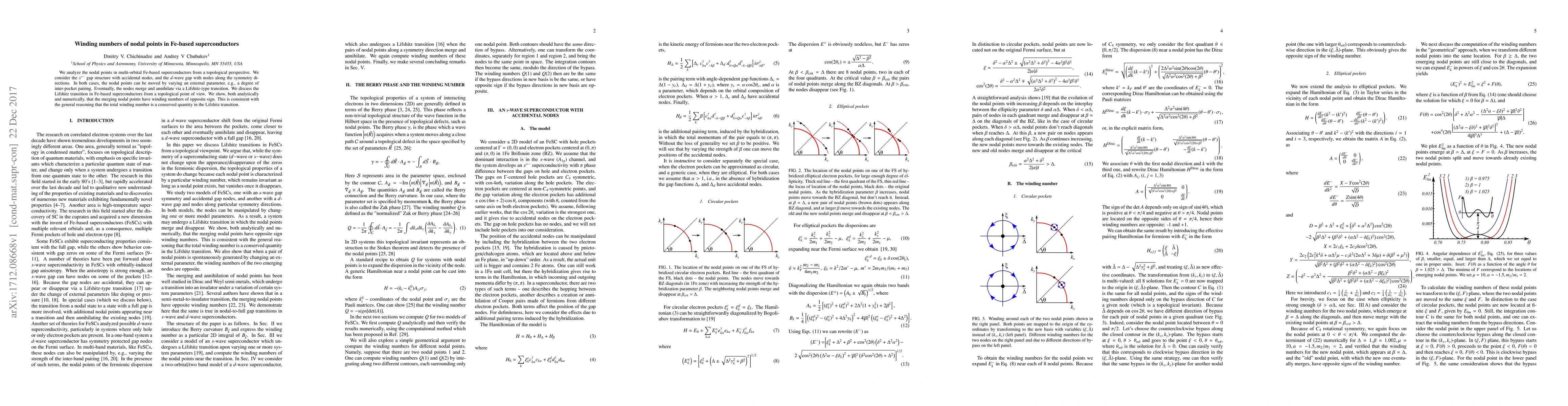 We analyze the nodal points in multi-orbital Fe-based superconductors from a topological perspective. We consider the $s^{+-}$ gap structure with accidental nodes, and the $d$-wave gap with nodes along the symmetry directions. In both cases, the nodal points can be moved by varying an external parameter, e.g., a degree of inter-pocket pairing. Eventually, the nodes merge and annihilate via a Lifshitz-type transition. We discuss the Lifshitz transition in Fe-based superconductors from a topological point of view. We show, both analytically and numerically, that the merging nodal points have winding numbers of opposite sign. This is consistent with the general reasoning that the total winding number is a conserved quantity in the Lifshitz transition.