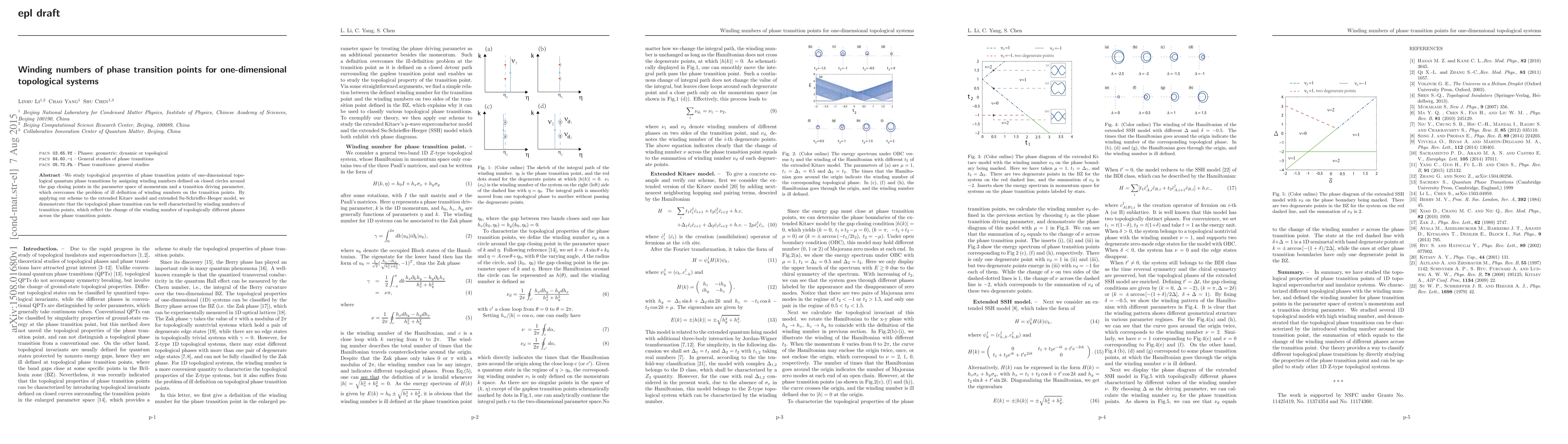 This paper investigates topological properties of phase transition points in one-dimensional quantum systems using winding numbers defined on closed circles around gap closing points. It demonstrates that winding numbers effectively characterize topological phase transitions in the extended Kitaev and Su-Schrieffer-Heeger models.