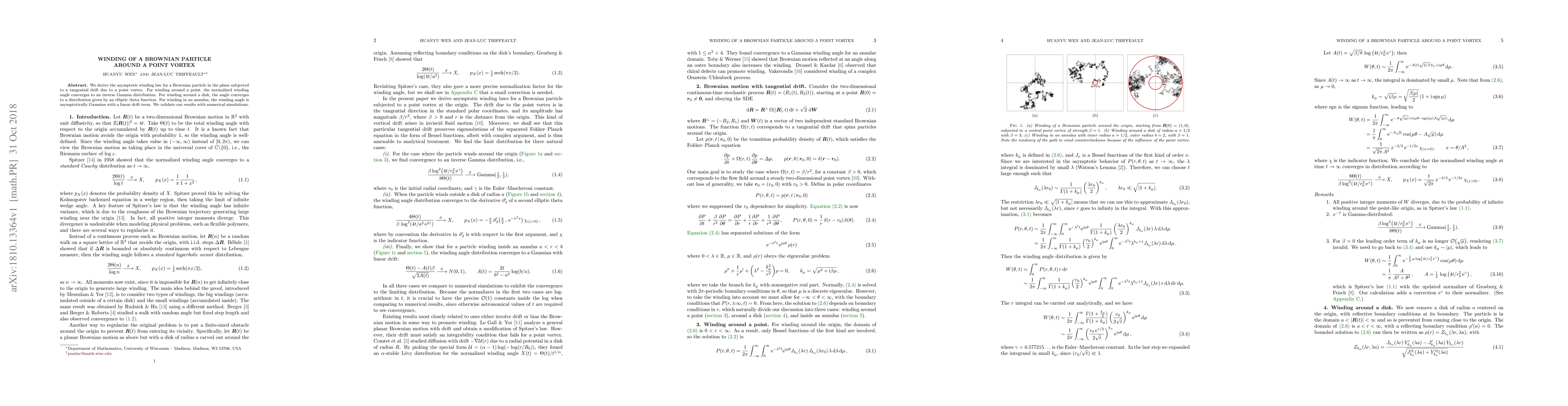 The research derives asymptotic winding laws for a Brownian particle influenced by a point vortex's tangential drift. For winding around a point, the normalized winding angle approaches an inverse Gamma distribution. Around a disk, it converges to a distribution from an elliptic theta function. In an annulus, the winding angle tends to a Gaussian distribution with a linear drift term. The findings are corroborated through numerical simulations.