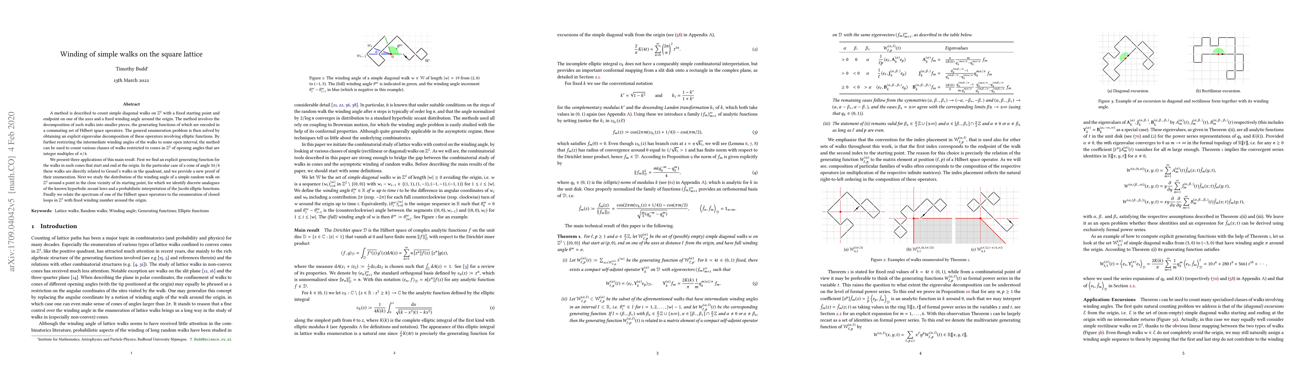 A method is described to count simple diagonal walks on $\mathbb{Z}^2$ with a fixed starting point and endpoint on one of the axes and a fixed winding angle around the origin. The method involves the decomposition of such walks into smaller pieces, the generating functions of which are encoded in a commuting set of Hilbert space operators. The general enumeration problem is then solved by obtaining an explicit eigenvalue decomposition of these operators involving elliptic functions. By further restricting the intermediate winding angles of the walks to some open interval, the method can be used to count various classes of walks restricted to cones in $\mathbb{Z}^2$ of opening angles that are integer multiples of $\pi/4$. We present three applications of this main result. First we find an explicit generating function for the walks in such cones that start and end at the origin. In the particular case of a cone of angle $3\pi/4$ these walks are directly related to Gessel's walks in the quadrant, and we provide a new proof of their enumeration. Next we study the distribution of the winding angle of a simple random walk on $\mathbb{Z}^2$ around a point in the close vicinity of its starting point, for which we identify discrete analogues of the known hyperbolic secant laws and a probabilistic interpretation of the Jacobi elliptic functions. Finally we relate the spectrum of one of the Hilbert space operators to the enumeration of closed loops in $\mathbb{Z}^2$ with fixed winding number around the origin.
