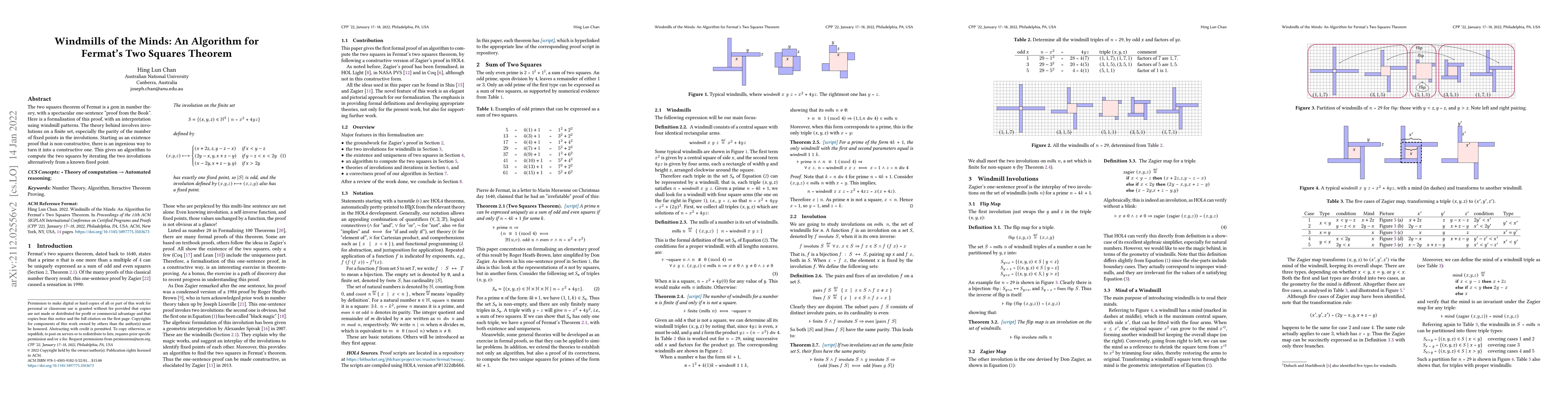 The two squares theorem of Fermat is a gem in number theory, with a spectacular one-sentence "proof from the Book". Here is a formalisation of this proof, with an interpretation using windmill patterns. The theory behind involves involutions on a finite set, especially the parity of the number of fixed points in the involutions. Starting as an existence proof that is non-constructive, there is an ingenious way to turn it into a constructive one. This gives an algorithm to compute the two squares by iterating the two involutions alternatively from a known fixed point.