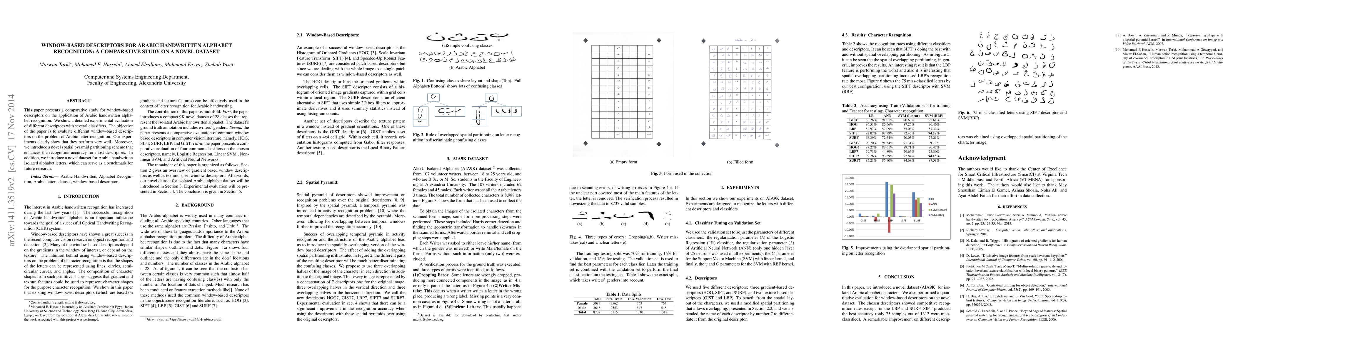 This paper evaluates various window-based descriptors for recognizing Arabic handwritten letters, demonstrating improved accuracy with a novel spatial pyramid partitioning scheme. It also introduces a new dataset for benchmark research in the field.