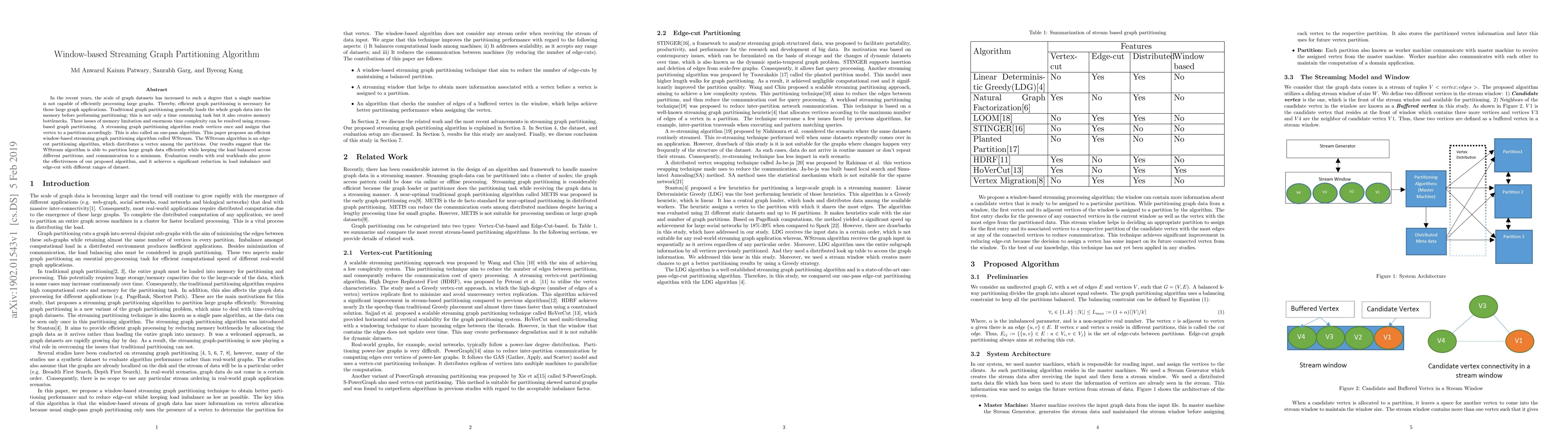 The paper proposes an efficient window-based streaming graph partitioning algorithm, WStream, to handle large-scale graph datasets by minimizing memory usage and time complexity. The algorithm achieves balanced load distribution and reduced communication costs, demonstrating effectiveness through evaluations on real workloads.