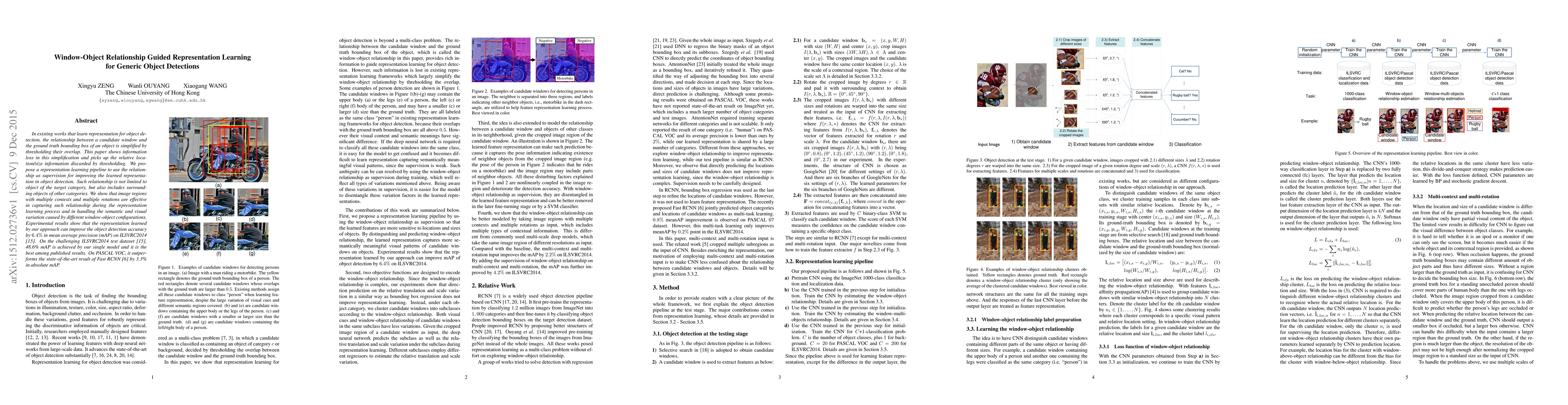 In existing works that learn representation for object detection, the relationship between a candidate window and the ground truth bounding box of an object is simplified by thresholding their overlap. This paper shows information loss in this simplification and picks up the relative location/size information discarded by thresholding. We propose a representation learning pipeline to use the relationship as supervision for improving the learned representation in object detection. Such relationship is not limited to object of the target category, but also includes surrounding objects of other categories. We show that image regions with multiple contexts and multiple rotations are effective in capturing such relationship during the representation learning process and in handling the semantic and visual variation caused by different window-object configurations. Experimental results show that the representation learned by our approach can improve the object detection accuracy by 6.4% in mean average precision (mAP) on ILSVRC2014. On the challenging ILSVRC2014 test dataset, 48.6% mAP is achieved by our single model and it is the best among published results. On PASCAL VOC, it outperforms the state-of-the-art result of Fast RCNN by 3.3% in absolute mAP.