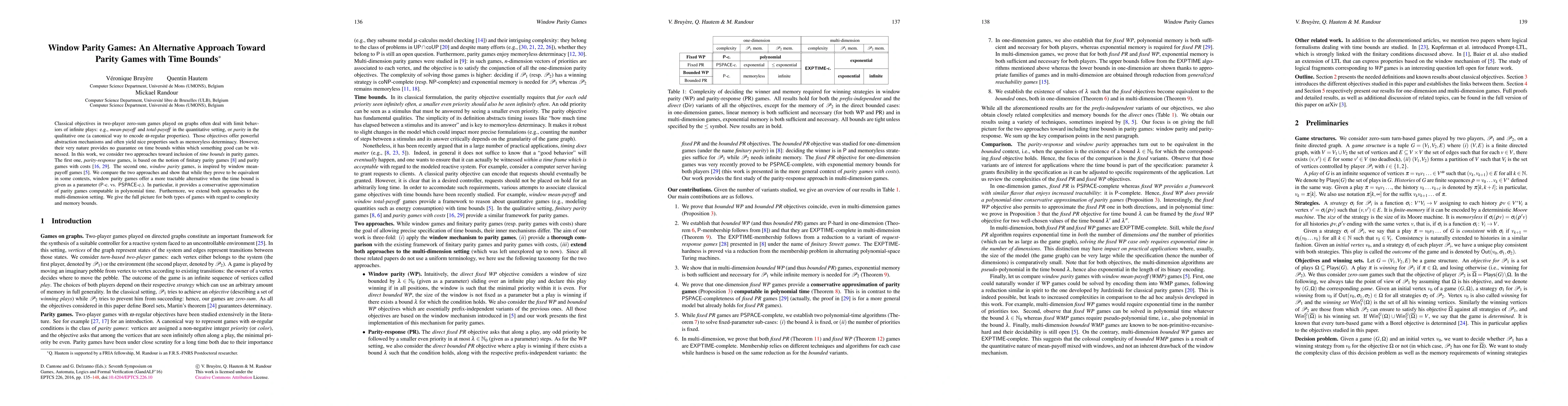 Classical objectives in two-player zero-sum games played on graphs often deal with limit behaviors of infinite plays: e.g., mean-payoff and total-payoff in the quantitative setting, or parity in the qualitative one (a canonical way to encode omega-regular properties). Those objectives offer powerful abstraction mechanisms and often yield nice properties such as memoryless determinacy. However, their very nature provides no guarantee on time bounds within which something good can be witnessed. In this work, we consider two approaches toward inclusion of time bounds in parity games. The first one, parity-response games, is based on the notion of finitary parity games [CHH09] and parity games with costs [FZ14,WZ16]. The second one, window parity games, is inspired by window mean-payoff games [CDRR15]. We compare the two approaches and show that while they prove to be equivalent in some contexts, window parity games offer a more tractable alternative when the time bound is given as a parameter (P-c. vs. PSPACE-c.). In particular, it provides a conservative approximation of parity games computable in polynomial time. Furthermore, we extend both approaches to the multi-dimension setting. We give the full picture for both types of games with regard to complexity and memory bounds. [CHH09] K. Chatterjee, T.A. Henzinger, F. Horn (2009): Finitary winning in omega-regular games. ACM Trans. Comput. Log. 11(1). [FZ14] N. Fijalkow, M. Zimmermann (2014): Parity and Streett Games with Costs. LMCS 10(2). [WZ16] A. Weinert, M. Zimmermann (2016): Easy to Win, Hard to Master: Optimal Strategies in Parity Games with Costs. Proc. of CSL, LIPIcs, Schloss Dagstuhl - LZI. To appear. [CDRR15] K. Chatterjee, L. Doyen, M. Randour, J.-F. Raskin (2015): Looking at mean-payoff and total-payoff through windows. Information and Computation 242, pp. 25-52.