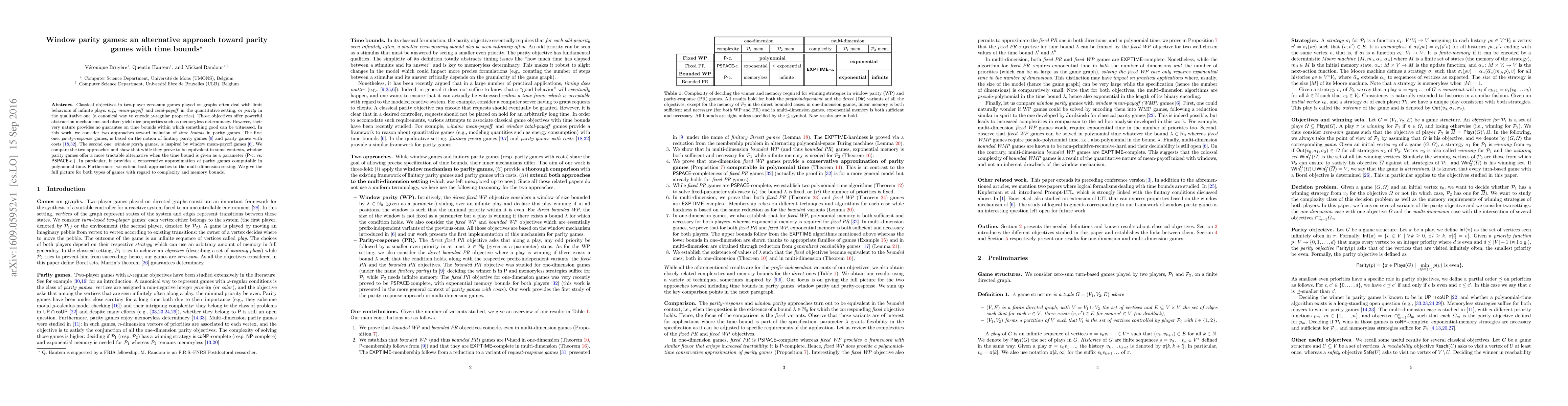 Classical objectives in two-player zero-sum games played on graphs often deal with limit behaviors of infinite plays: e.g., mean-payoff and total-payoff in the quantitative setting, or parity in the qualitative one (a canonical way to encode omega-regular properties). Those objectives offer powerful abstraction mechanisms and often yield nice properties such as memoryless determinacy. However, their very nature provides no guarantee on time bounds within which something good can be witnessed. In this work, we consider two approaches toward inclusion of time bounds in parity games. The first one, parity-response games, is based on the notion of finitary parity games [CHH09] and parity games with costs [FZ14,WZ16]. The second one, window parity games, is inspired by window mean-payoff games [CDRR15]. We compare the two approaches and show that while they prove to be equivalent in some contexts, window parity games offer a more tractable alternative when the time bound is given as a parameter (P-c. vs. PSPACE-C.). In particular, it provides a conservative approximation of parity games computable in polynomial time. Furthermore, we extend both approaches to the multi-dimension setting. We give the full picture for both types of games with regard to complexity and memory bounds. [CHH09] K. Chatterjee, T.A. Henzinger, F. Horn (2009): Finitary winning in omega-regular games. ACM Trans. Comput. Log. 11(1). [FZ14] N. Fijalkow, M. Zimmermann (2014): Parity and Streett Games with Costs. LMCS 10(2). [WZ16] A. Weinert, M. Zimmermann (2016): Easy to Win, Hard to Master: Optimal Strategies in Parity Games with Costs. Proc. of CSL, LIPIcs 62, pp. 31:1-31:17, Schloss Dagstuhl - LZI. [CDRR15] K. Chatterjee, L. Doyen, M. Randour, J.-F. Raskin (2015): Looking at mean-payoff and total-payoff through windows. Information and Computation 242, pp. 25-52.