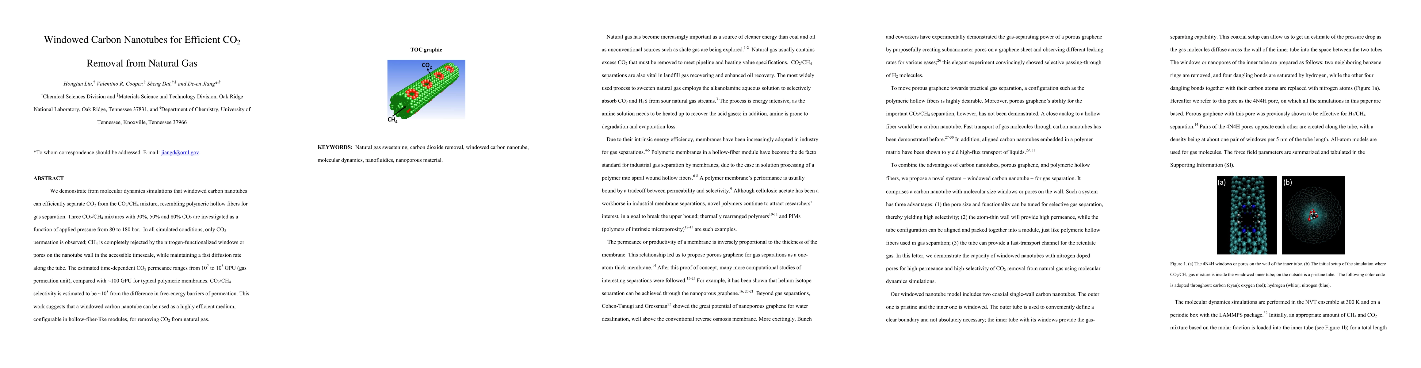 We demonstrate from molecular dynamics simulations that windowed carbon nanotubes can efficiently separate CO2 from the CO2/CH4 mixture, resembling polymeric hollow fibers for gas separation. Three CO2/CH4 mixtures with 30%, 50% and 80% CO2 are investigated as a function of applied pressure from 80 to 180 bar. In all simulated conditions, only CO2 permeation is observed; CH4 is completely rejected by the nitrogen-functionalized windows or pores on the nanotube wall in the accessible timescale, while maintaining a fast diffusion rate along the tube. The estimated time-dependent CO2 permeance ranges from 107 to 105 GPU (gas permeation unit), compared with ~100 GPU for typical polymeric membranes. CO2/CH4 selectivity is estimated to be ~108 from the difference in free-energy barriers of permeation. This work suggests that a windowed carbon nanotube can be used as a highly efficient medium, configurable in hollow-fiber-like modules, for removing CO2 from natural gas.