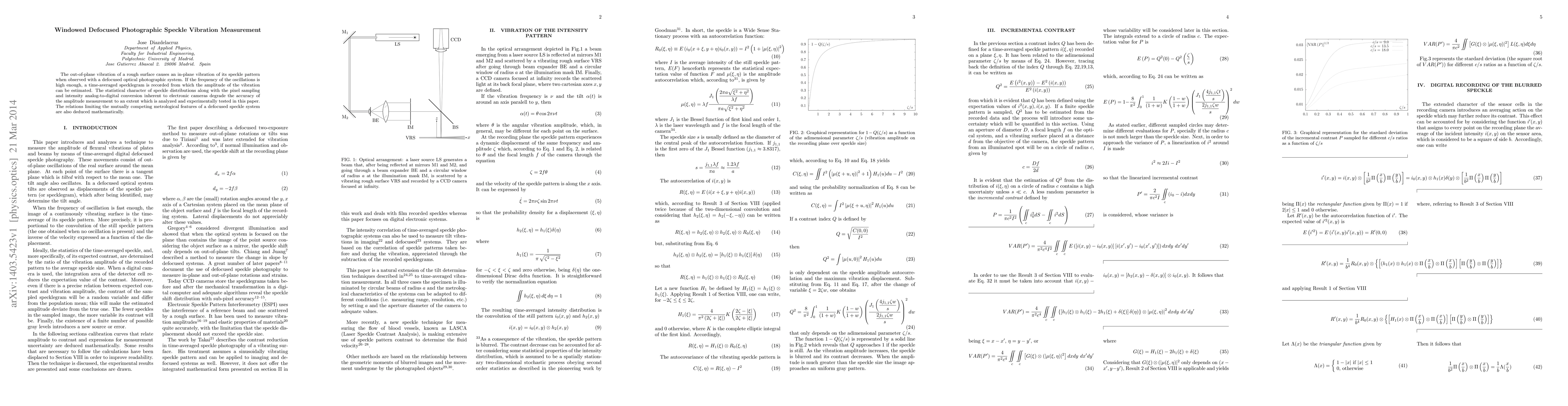 This paper explores the use of defocused photographic speckle patterns to measure out-of-plane vibrations on rough surfaces, analyzing the accuracy limitations due to statistical speckle distributions and electronic camera sampling. It deduces mathematical relations that define the trade-offs in the measurement precision of such systems.