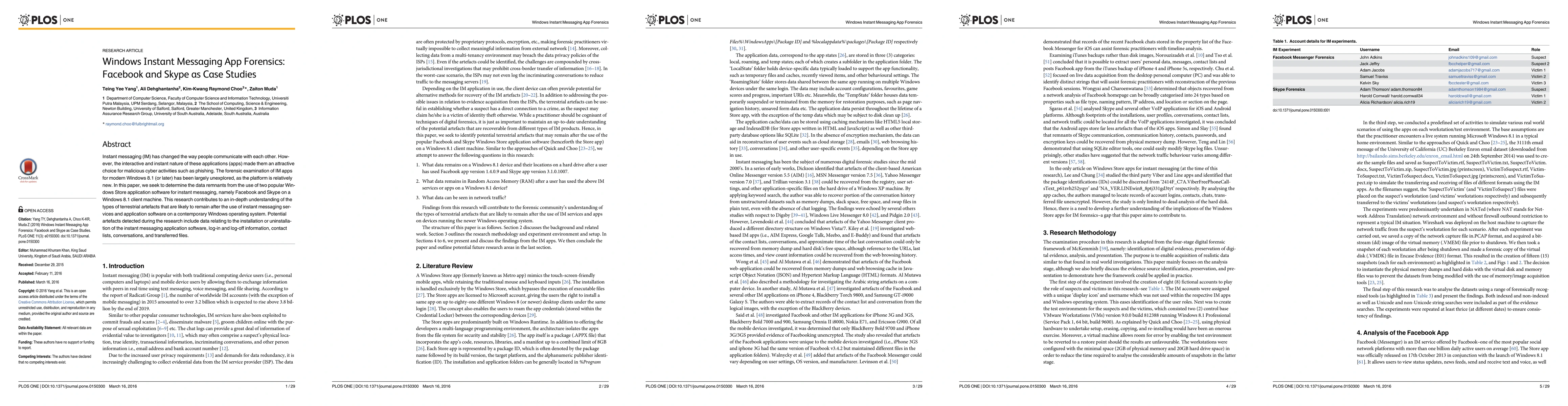 This paper investigates the forensic remnants of Facebook and Skype instant messaging apps on Windows 8.1, identifying data artefacts such as installation logs, login details, contact lists, chat history, and file transfers that persist after usage. The study aims to enhance understanding of digital evidence in contemporary Windows operating systems.
