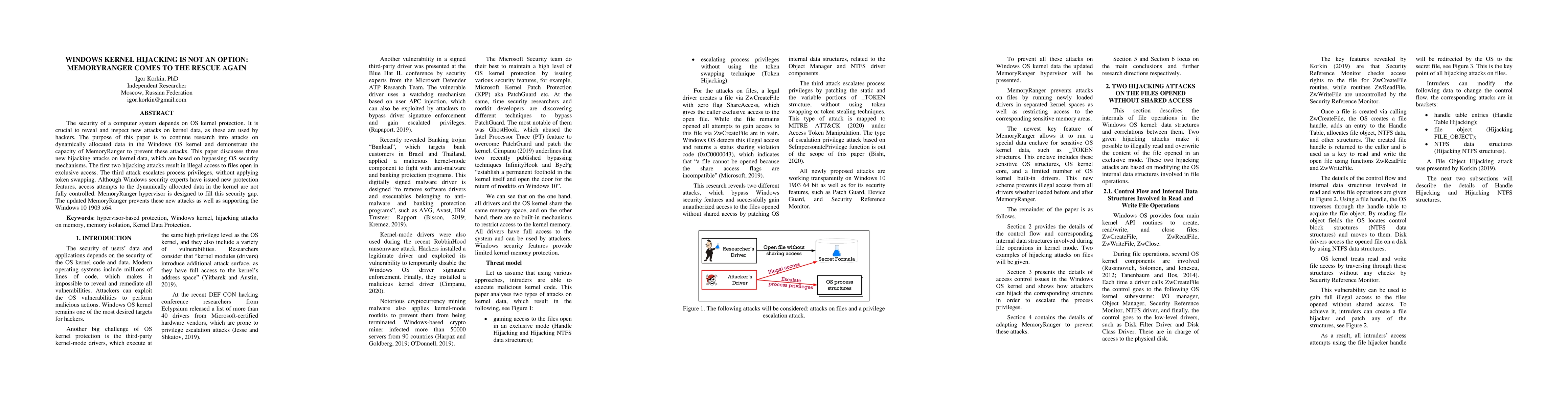 This paper investigates new attacks on dynamically allocated data in the Windows OS kernel, focusing on three new hijacking methods that bypass security mechanisms. MemoryRanger, a hypervisor, is presented as a solution to prevent these attacks and fill existing security gaps in the Windows kernel.