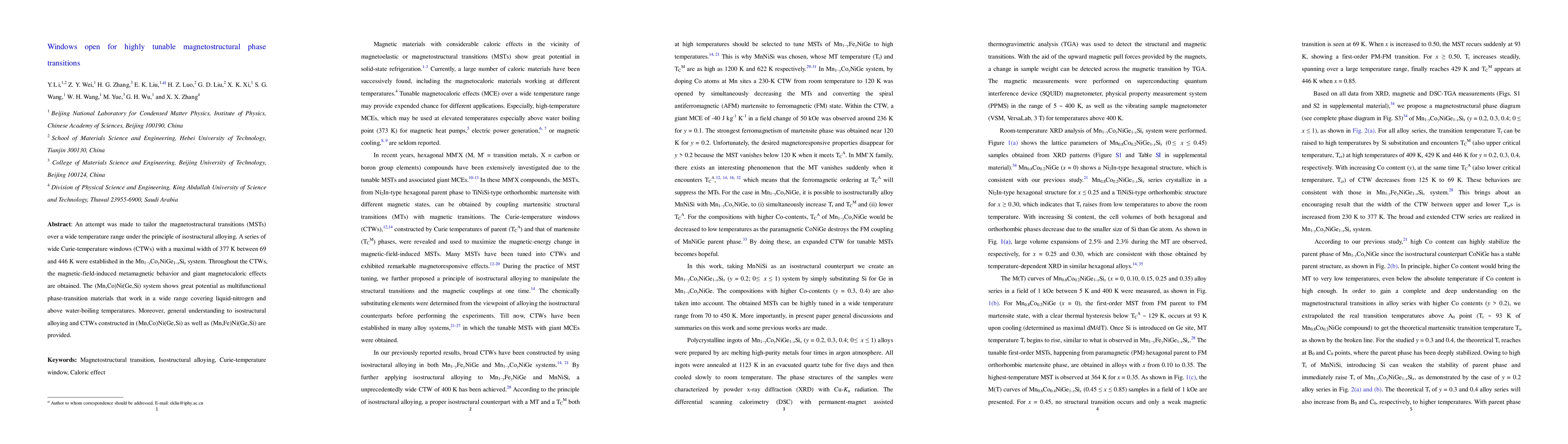 An attempt was made to tailor the magnetostructural transitions (MSTs) over a wide temperature range under the principle of isostructural alloying. A series of wide Curie-temperature windows (CTWs) with a maximal width of 377 K between 69 and 446 K were established in the Mn1-yCoyNiGe1-xSix system. Throughout the CTWs, the magnetic-field-induced metamagnetic behavior and giant magnetocaloric effects are obtained. The (Mn,Co)Ni(Ge,Si) system shows great potential as multifunctional phase-transition materials that work in a wide range covering liquid-nitrogen and above water-boiling temperatures. Moreover, general understanding to isostructural alloying and CTWs constructed in (Mn,Co)Ni(Ge,Si) as well as (Mn,Fe)Ni(Ge,Si) are provided.