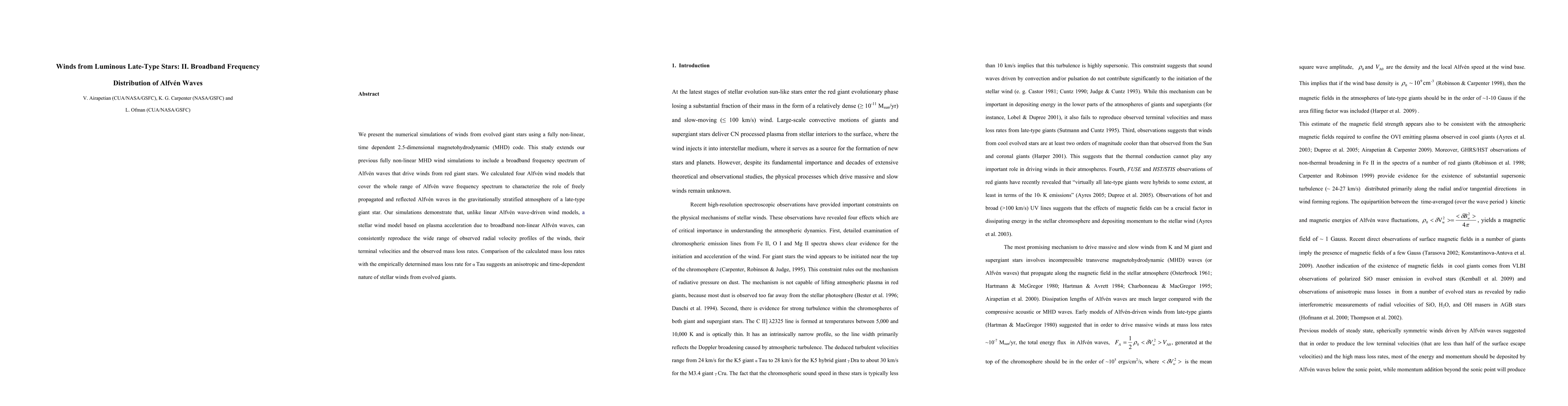 This paper uses advanced magnetohydrodynamic simulations to explore winds from luminous giant stars, focusing on the broadband frequency distribution of Alfv\'en waves. The study finds that non-linear Alfv\'en waves can reproduce observed wind characteristics, indicating an anisotropic and time-dependent nature of stellar winds from evolved giants.