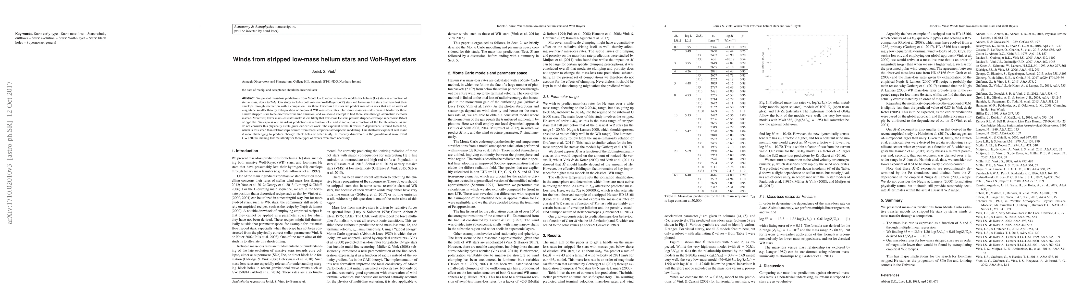 This study uses Monte Carlo radiative transfer models to predict lower mass-loss rates for low-mass helium stars compared to massive Wolf-Rayet stars. These reduced rates make detection through line emission difficult, suggesting alternative discovery methods. The findings also imply fewer stripped-envelope type Ibc supernovae from low-mass helium stars, complicating the formation of heavy black holes like those observed in GW 150914, emphasizing the need for low metallicity environments.