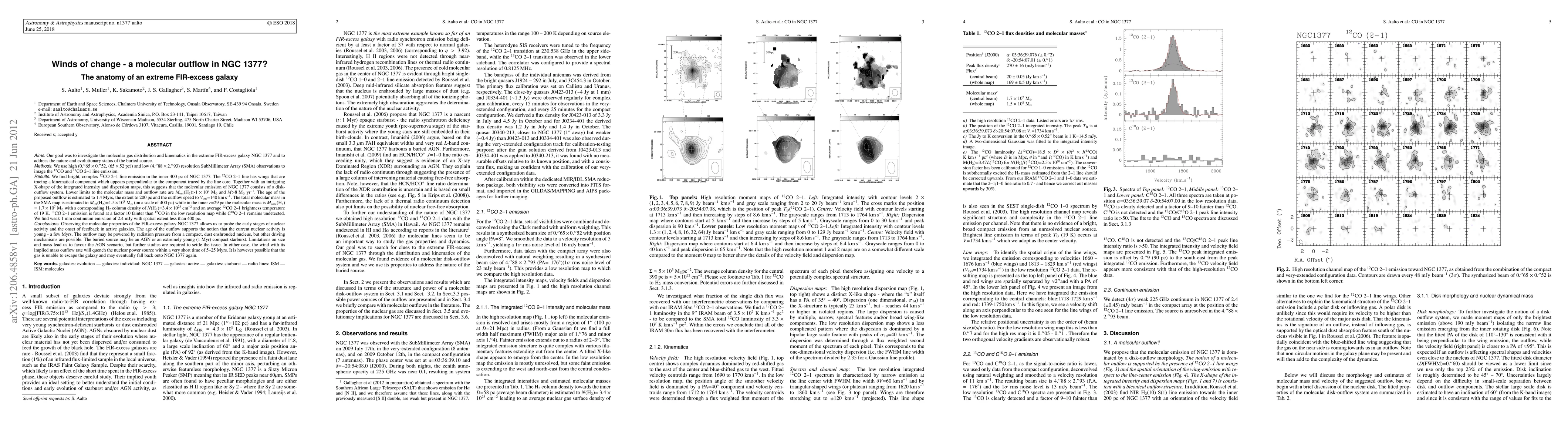 We use high (0."65 x 0."52,(65x52pc)) resolution SubMillimeter Array (SMA) observations to image the CO and 13CO 2-1 line emission of the extreme FIR-excess galaxy NGC 1377. We find bright, complex CO 2-1 line emission in the inner 400 pc of the galaxy. The CO 2-1 line has wings that are tracing a kinematical component which appears perpendicular to that of the line core. Together with an intriguing X-shape of the integrated intensity and dispersion maps, this suggests that the molecular emission of NGC 1377 consists of a disk-outflow system. Lower limits to the molecular mass and outflow rate are M_out(H2)>1e7 Msun and dM/dt>8 Msun/yr. The age of the proposed outflow is estimated to 1.4Myrs, the extent to 200pc and the outflow speed to 140 km/s. The total molecular mass in the SMA map is estimated to M_tot(H2)=1.5e8 Msun (on a scale of 400 pc) while in the inner r=29 pc the molecular mass is M_core(H2)=1.7e7 Msun with a corresponding H2 column density of N(H2)=3.4e23 cm-2 and an average CO 2-1 brightness temperature of 19K. Observing the molecular properties of the FIR-excess galaxy NGC 1377 allows us to probe the early stages of nuclear activity and the onset of feedback in active galaxies. The age of the outflow supports the notion that the current nuclear activity is young - a few Myrs. The outflow may be powered by radiation pressure from a compact, dust enshrouded nucleus, but other driving mechanisms are possible. The buried source may be an AGN or an extremely young (1Myr) compact starburst. Limitations on size and mass lead us to favour the AGN scenario, but further studies are required to settle the issue. In either case, the wind with its implied mass outflow rate will quench the nuclear power source within a very short time of 5-25 Myrs. It is however possible that the gas is unable to escape the galaxy and may eventually fall back onto NGC 1377 again.