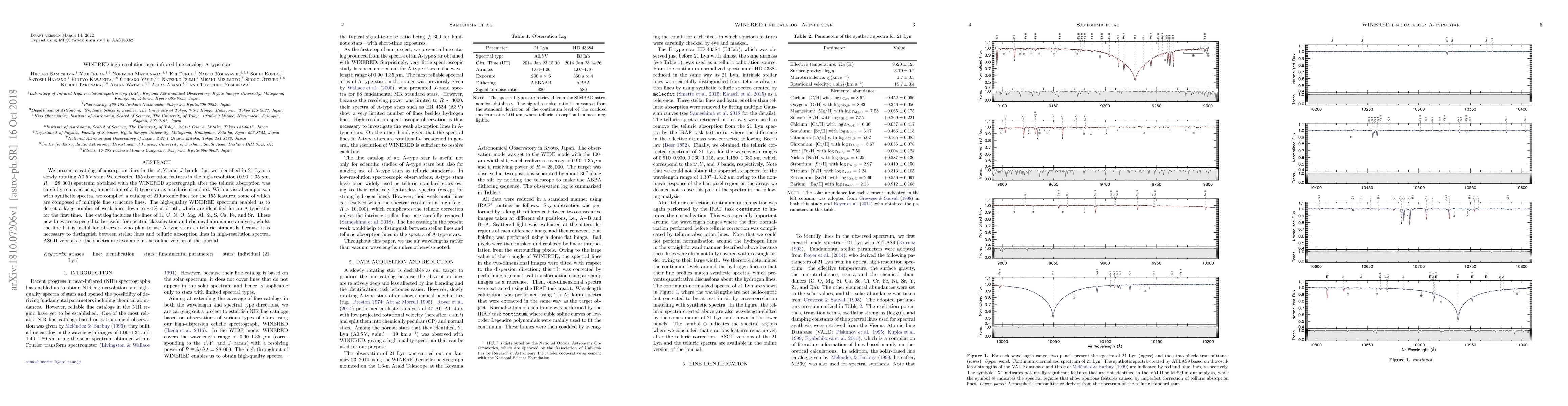 We present a catalog of absorption lines in the z', Y, and J bands that we identified in 21 Lyn, a slowly rotating A0.5 V star. We detected 155 absorption features in the high-resolution (0.90-1.35 um, R = 28,000) spectrum obtained with the WINERED spectrograph after the telluric absorption was carefully removed using a spectrum of a B-type star as a telluric standard. With a visual comparison with synthetic spectra, we compiled a catalog of 219 atomic lines for the 155 features, some of which are composed of multiple fine structure lines. The high-quality WINERED spectrum enabled us to detect a large number of weak lines down to ~1% in depth, which are identified for an A-type star for the first time. The catalog includes the lines of H, C, N, O, Mg, Al, Si, S, Ca, Fe, and Sr. These new lines are expected to be useful for spectral classification and chemical abundance analyses, whilst the line list is useful for observers who plan to use A-type stars as telluric standards because it is necessary to distinguish between stellar lines and telluric absorption lines in high-resolution spectra. ASCII versions of the spectra are available in the online version of the journal.