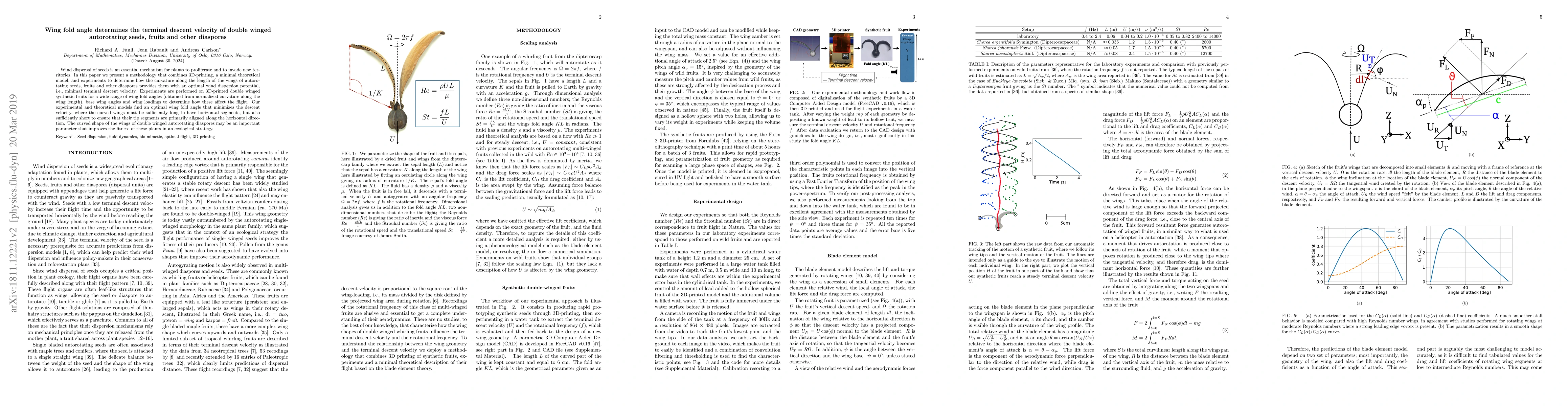 Wind dispersal of seeds is one essential mechanisms for plants to proliferate and to invade new territories. In this paper we present a methodology that combines 3D-printing, a minimal theoretical model and experiments to determine the shape of multi-winged autorotating seeds, fruits and other diaspores that provide them with the optimal wind dispersion potential i.e. minimal terminal descent velocity. Experiments are performed on 3D-printed synthetic fruits for a wide range of wing fold angles, base wing angles and wing loadings to determine how these affect the flight. Our experimental and theoretical model find an optimal wing fold angle that minimizes the descent velocity, which may be an important parameter that improves the fitness of these plants in an ecological strategy.