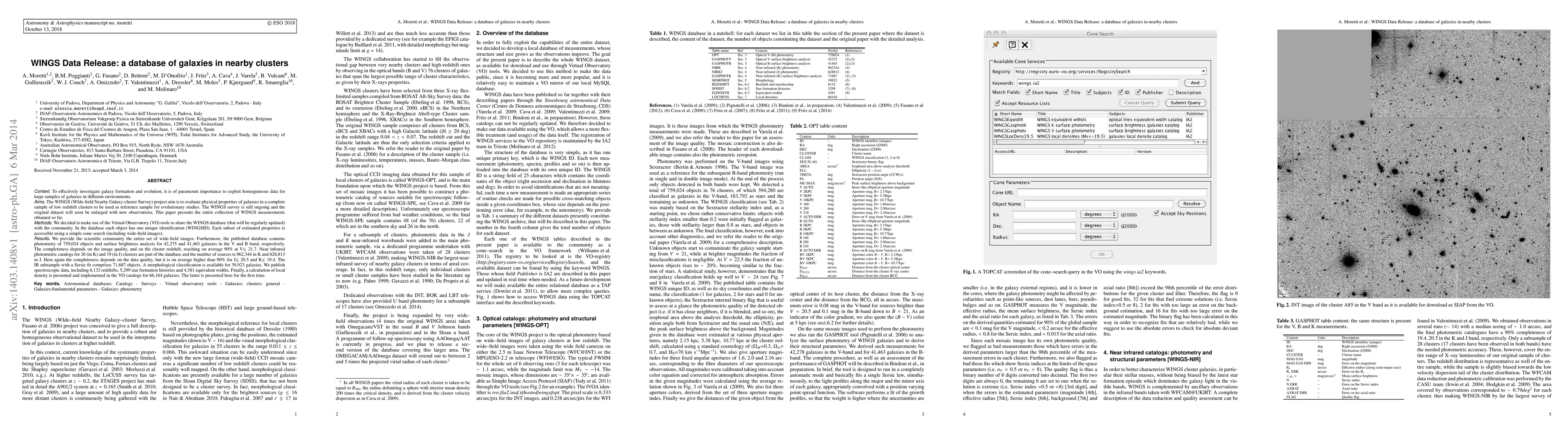 The WINGS survey provides a comprehensive database of galaxies in nearby clusters, featuring extensive photometric and spectroscopic data, including wide-field images, surface brightness analysis, and morphological classifications. The database aims to support galaxy formation and evolution studies, with ongoing updates and access via Virtual Observatory tools.