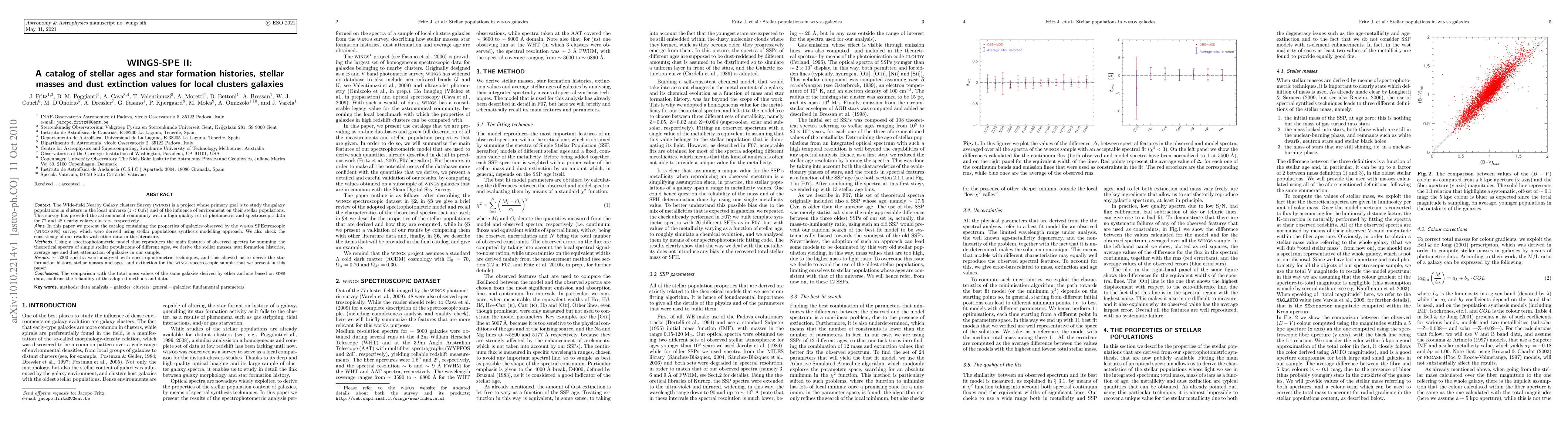 This paper presents a catalog derived from the WINGS-SPE survey, detailing stellar ages, star formation histories, stellar masses, and dust extinction values for galaxies in nearby clusters. The analysis, based on spectrophotometric modeling of ~5300 spectra, confirms the reliability of the methods through comparison with other data sources.