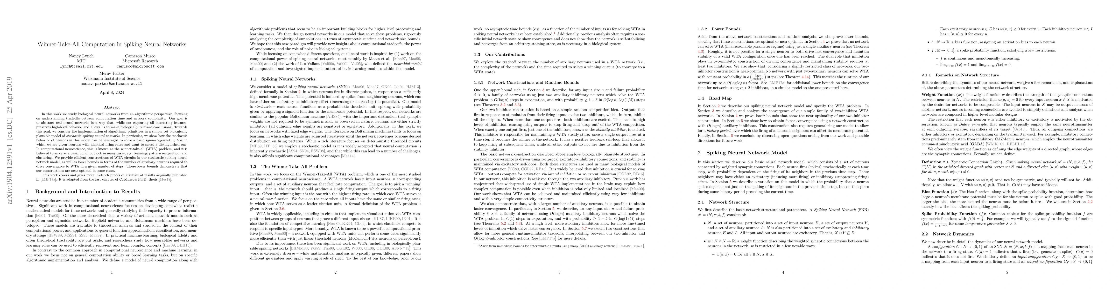 This paper explores the implementation of algorithmic primitives in stochastic spiking neural networks to solve the winner-take-all (WTA) problem, demonstrating efficient WTA circuit constructions and proving near-optimality in terms of neuron count. The study aims to abstract real neural networks to draw biologically relevant conclusions.