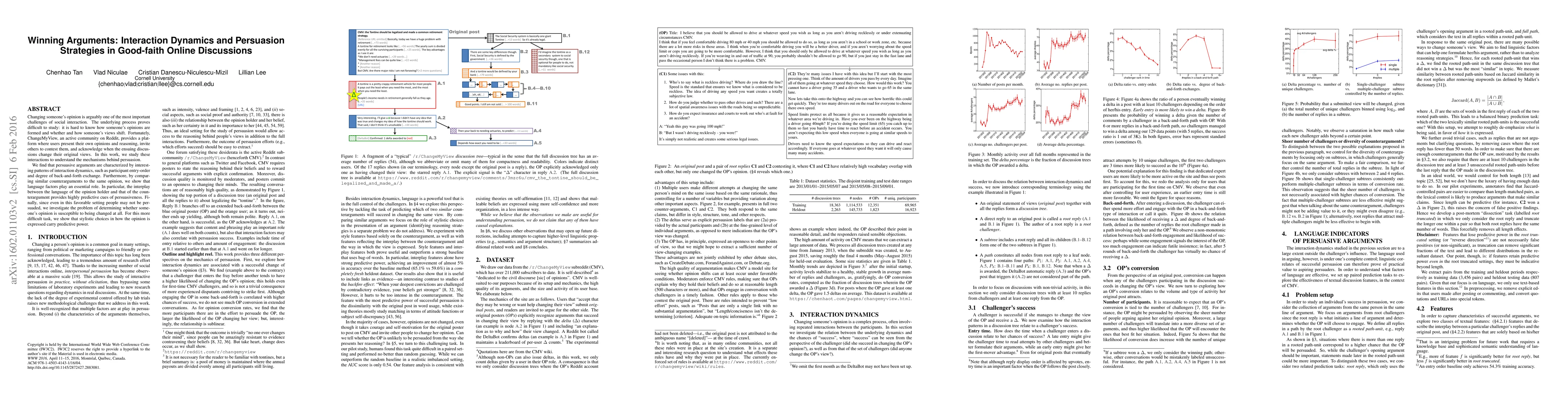 This paper examines how persuasion occurs in good-faith online discussions on Reddit's ChangeMyView, finding that persuasive arguments are influenced by interaction dynamics and language factors. It also explores how stylistic elements of opinion expression can predict susceptibility to change.