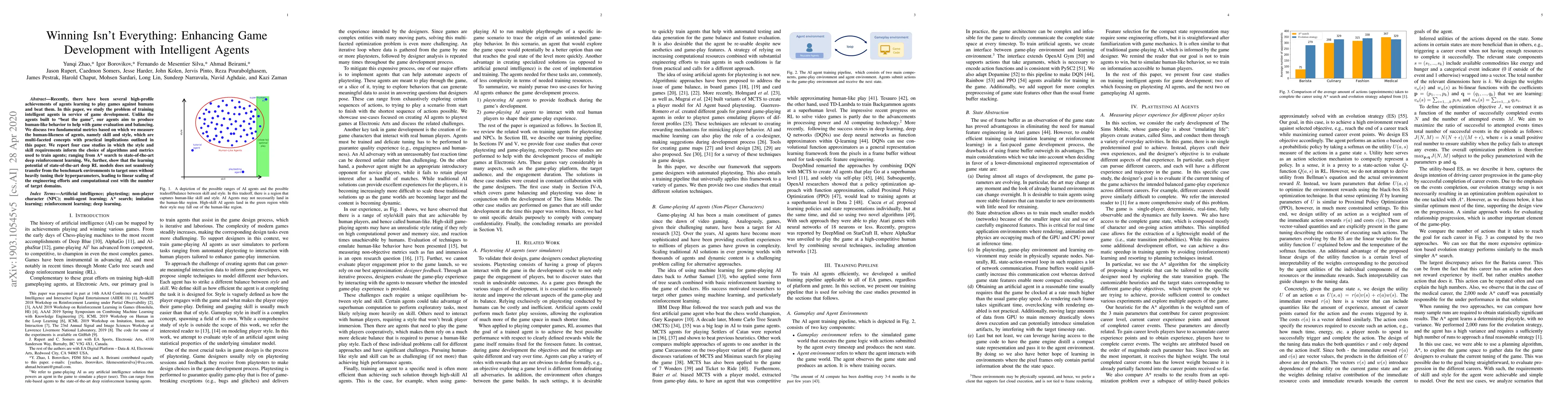 Recently, there have been several high-profile achievements of agents learning to play games against humans and beat them. In this paper, we study the problem of training intelligent agents in service of game development. Unlike the agents built to "beat the game", our agents aim to produce human-like behavior to help with game evaluation and balancing. We discuss two fundamental metrics based on which we measure the human-likeness of agents, namely skill and style, which are multi-faceted concepts with practical implications outlined in this paper. We report four case studies in which the style and skill requirements inform the choice of algorithms and metrics used to train agents; ranging from A* search to state-of-the-art deep reinforcement learning. We, further, show that the learning potential of state-of-the-art deep RL models does not seamlessly transfer from the benchmark environments to target ones without heavily tuning their hyperparameters, leading to linear scaling of the engineering efforts and computational cost with the number of target domains.