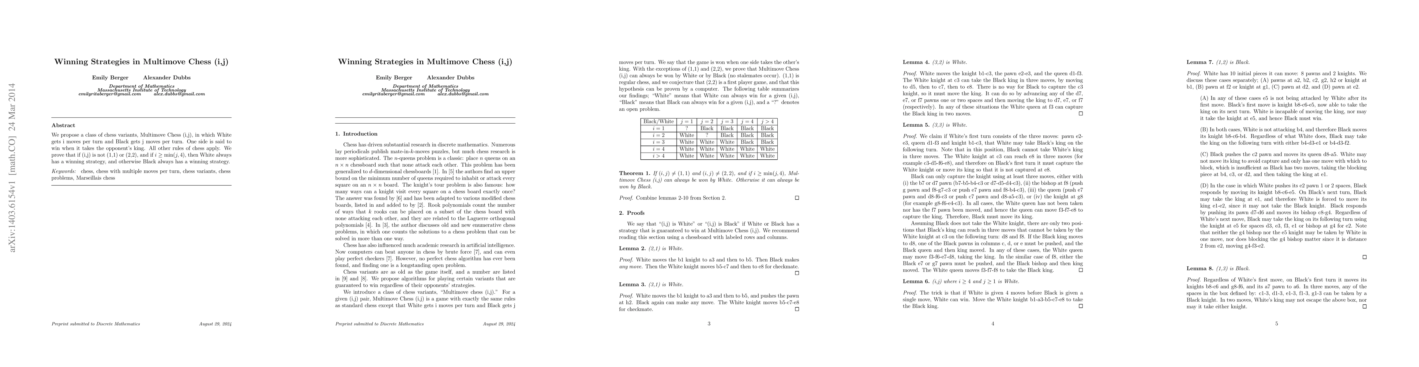 This paper introduces Multimove Chess variants where White and Black have different move allotments. It demonstrates that when the move allocation is not standard (1,1) or balanced (2,2), White wins if it has at least as many moves as Black or four more, otherwise Black wins.