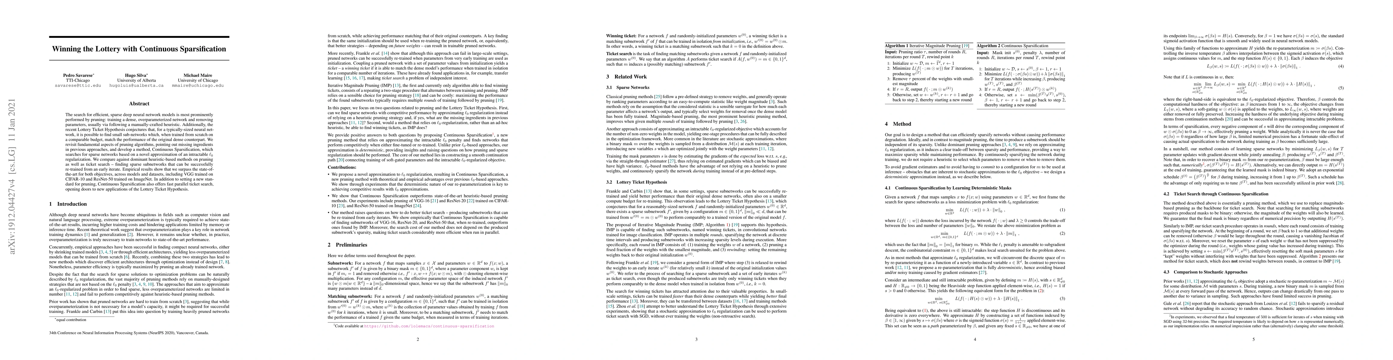 The search for efficient, sparse deep neural network models is most prominently performed by pruning: training a dense, overparameterized network and removing parameters, usually via following a manually-crafted heuristic. Additionally, the recent Lottery Ticket Hypothesis conjectures that, for a typically-sized neural network, it is possible to find small sub-networks which, when trained from scratch on a comparable budget, match the performance of the original dense counterpart. We revisit fundamental aspects of pruning algorithms, pointing out missing ingredients in previous approaches, and develop a method, Continuous Sparsification, which searches for sparse networks based on a novel approximation of an intractable $\ell_0$ regularization. We compare against dominant heuristic-based methods on pruning as well as ticket search -- finding sparse subnetworks that can be successfully re-trained from an early iterate. Empirical results show that we surpass the state-of-the-art for both objectives, across models and datasets, including VGG trained on CIFAR-10 and ResNet-50 trained on ImageNet. In addition to setting a new standard for pruning, Continuous Sparsification also offers fast parallel ticket search, opening doors to new applications of the Lottery Ticket Hypothesis.