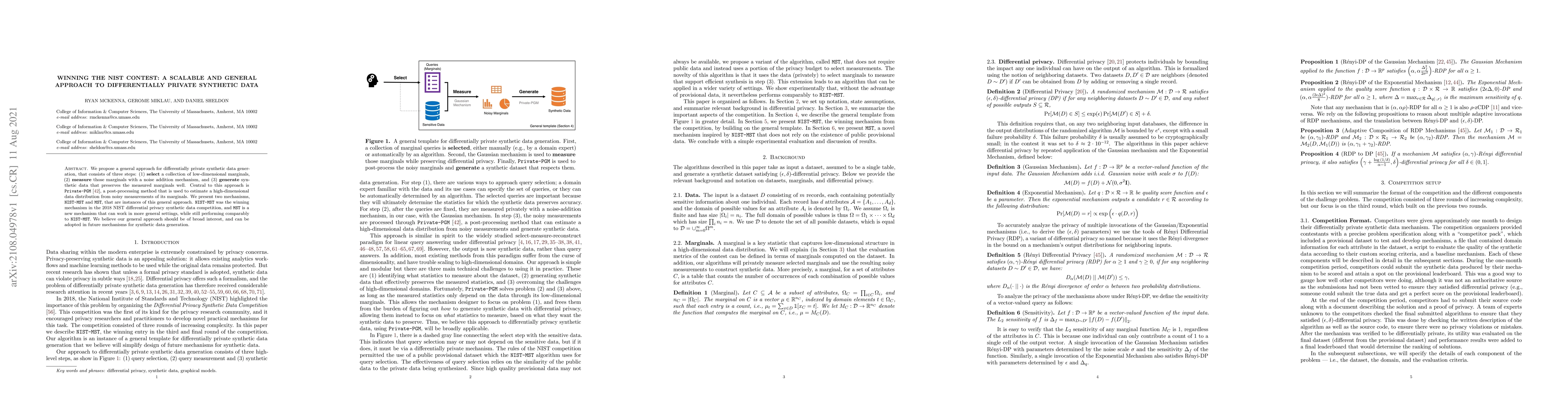 The paper proposes a scalable and general method for generating differentially private synthetic data through three steps: selecting low-dimensional marginals, measuring them with noise addition, and generating synthetic data that preserves these marginals. The method employs Private-PGM for estimating high-dimensional distributions and introduces NIST-MST, the winning 2018 NIST competition mechanism, and MST, a new mechanism adaptable to broader settings.