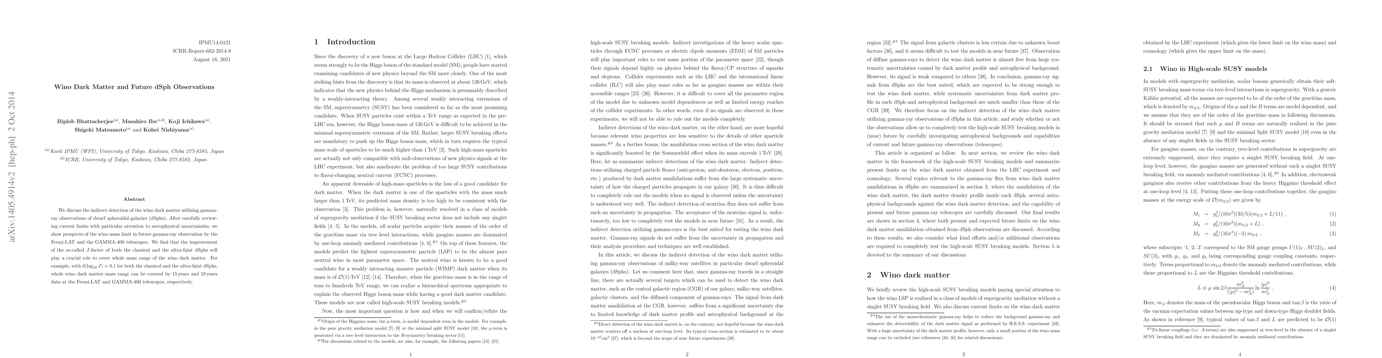 The paper discusses indirect detection of wino dark matter using gamma-ray observations of dwarf spheroidal galaxies (dSphs), focusing on the role of improved $J$-factor estimates from both classical and ultra-faint dSphs for future gamma-ray observations by Fermi-LAT and GAMMA-400 telescopes.