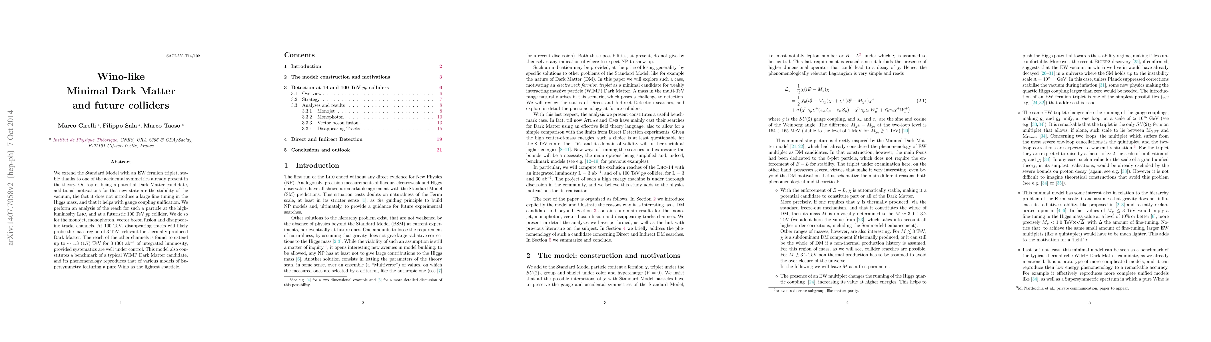 We extend the Standard Model with an EW fermion triplet, stable thanks to one of the accidental symmetries already present in the theory. On top of being a potential Dark Matter candidate, additional motivations for this new state are the stability of the vacuum, the fact it does not introduce a large fine-tuning in the Higgs mass, and that it helps with gauge coupling unification. We perform an analysis of the reach for such a particle at the high-luminosity LHC, and at a futuristic 100 TeV pp collider. We do so for the monojet, monophoton, vector boson fusion and disappearing tracks channels. At 100 TeV, disappearing tracks will likely probe the mass region of 3 TeV, relevant for thermally produced Dark Matter. The reach of the other channels is found to extend up to ~ 1.3 (1.7) TeV for 3 (30) ab^-1 of integrated luminosity, provided systematics are well under control. This model also constitutes a benchmark of a typical WIMP Dark Matter candidate, and its phenomenology reproduces that of various models of Supersymmetry featuring a pure Wino as the lightest sparticle.