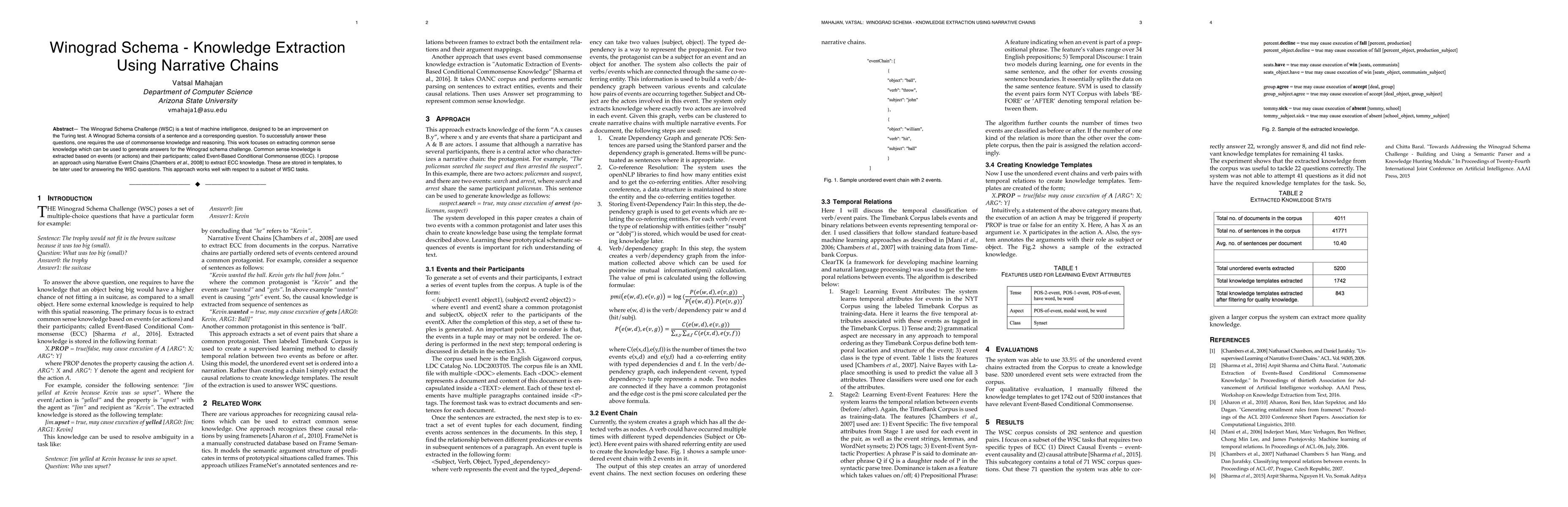 The Winograd Schema Challenge (WSC) is a test of machine intelligence, designed to be an improvement on the Turing test. A Winograd Schema consists of a sentence and a corresponding question. To successfully answer these questions, one requires the use of commonsense knowledge and reasoning. This work focuses on extracting common sense knowledge which can be used to generate answers for the Winograd schema challenge. Common sense knowledge is extracted based on events (or actions) and their participants; called Event-Based Conditional Commonsense (ECC). I propose an approach using Narrative Event Chains [Chambers et al., 2008] to extract ECC knowledge. These are stored in templates, to be later used for answering the WSC questions. This approach works well with respect to a subset of WSC tasks.